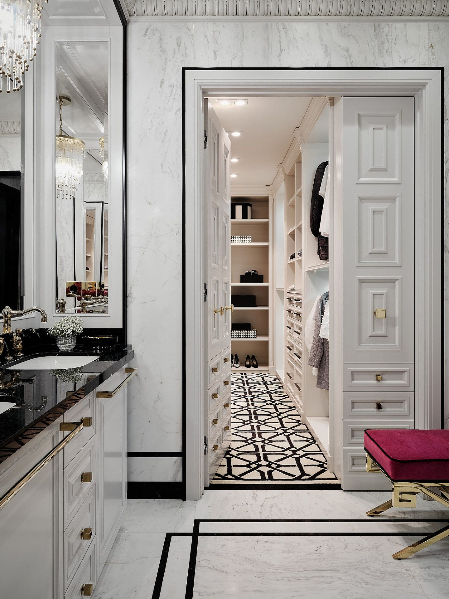 Помещение условно разделено на 4 части: прихожую с хозяйственными блоками (гардеробной и постирочной), общую кухню-столовую-гостиную, детскую зону из 3 спален с санузлом и наконец хозяйскую часть со спальней, гардеробной и санузлом.