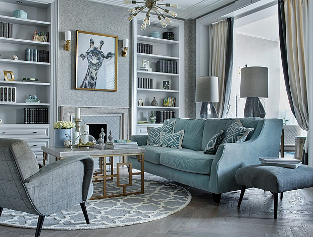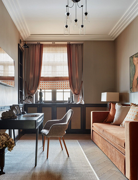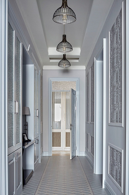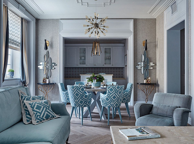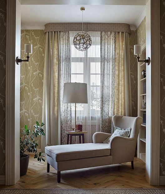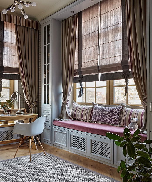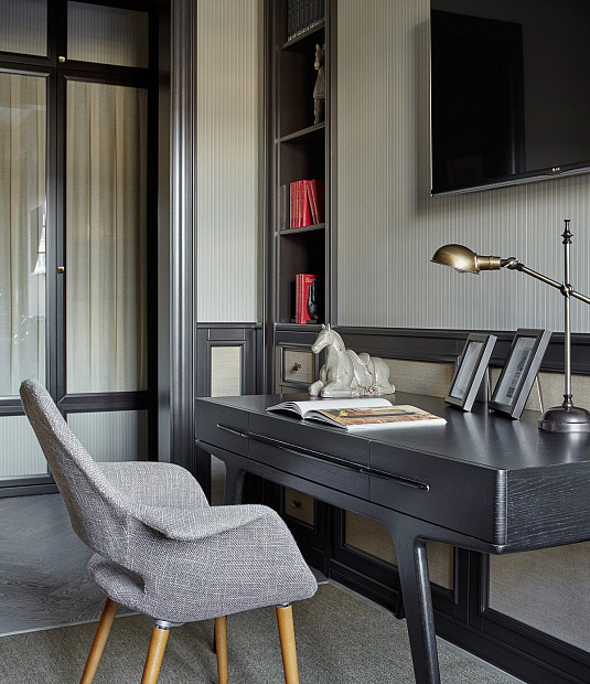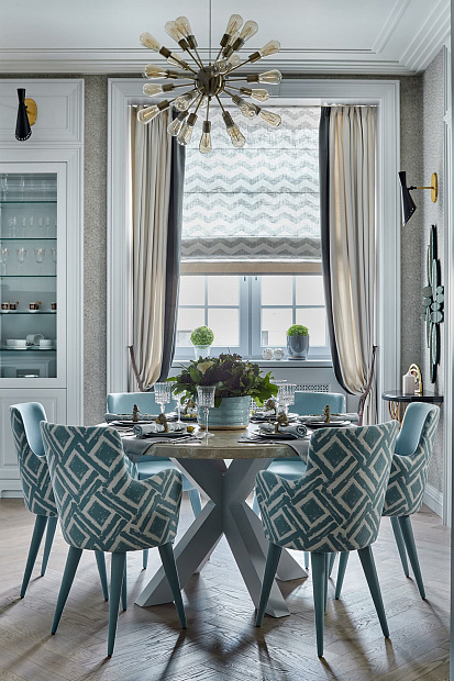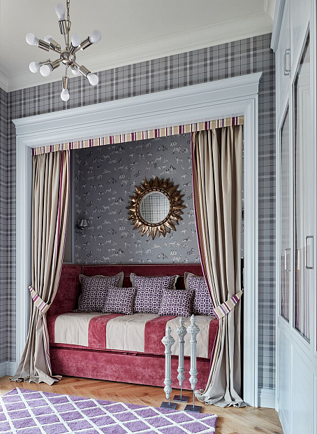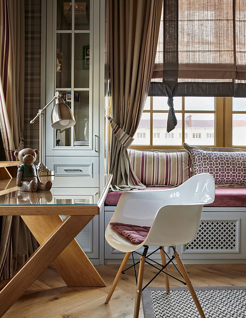 Игровой эксперимент с неоклассикой в просторной квартире для семьи с ребенком. Интересный дизайнерский ход проекта – сложная планировка, в которой некоторые помещения остаются единым пространством, но при этом функционально и визуально разграничены на зоны. Так, кухня и гостиная перемежаются декоративным порталом, а в спальне зона для сна отделена от уголка для чтения с козеткой и стеллажом для книг. В детской также условно выделены две части — игровое пространство с рабочим столом и уютная ниша с кроватью в обрамлении декоративных штор. Обилие ниш в квартире использовано для встроенной мебели и украшения помещения. Например, в гостиной по бокам от каминного портала в нишах расположены шкафы для книг и вещей, а ниша в прихожей с консольным столом, фотографиями и картиной создает домашнее настроение при входе в квартиру. Колористика и узоры в каждой комнате, мебель на заказ по авторским чертежам и картины с эмоциональными сюжетами создают максимально персонифицированную под вкусы хозяев атмосферу.