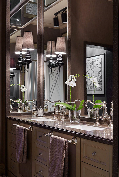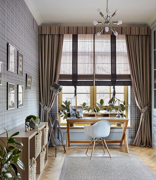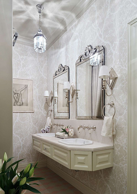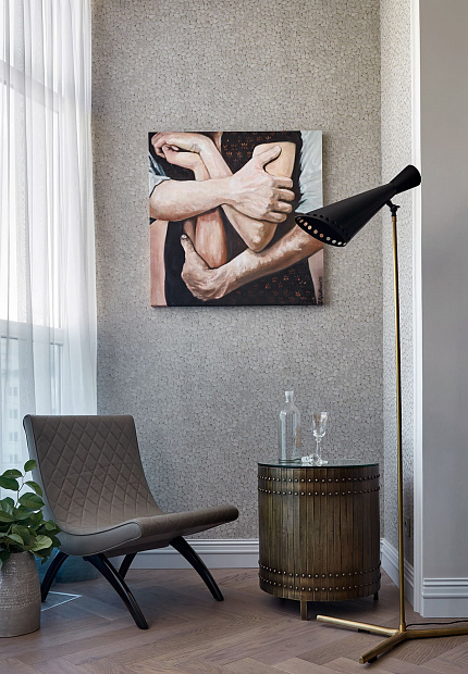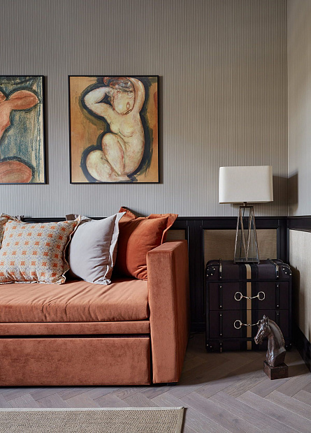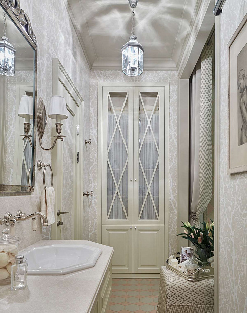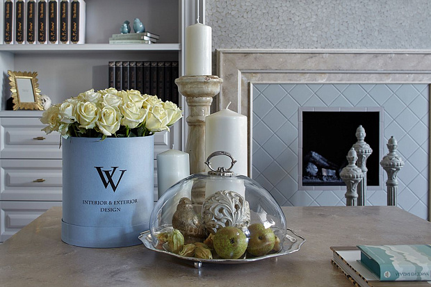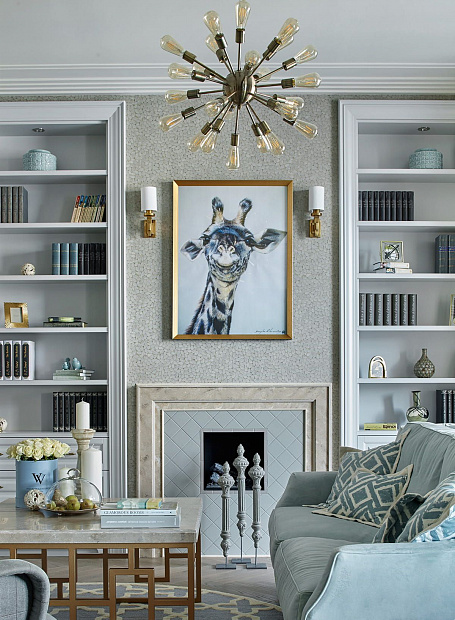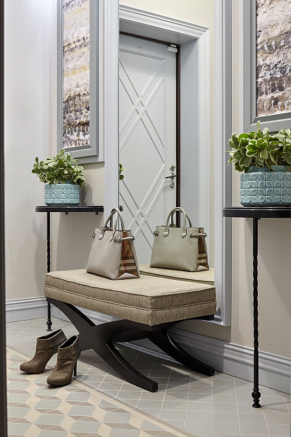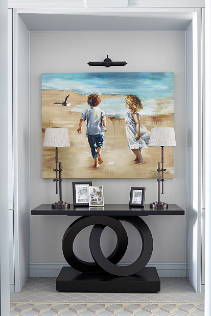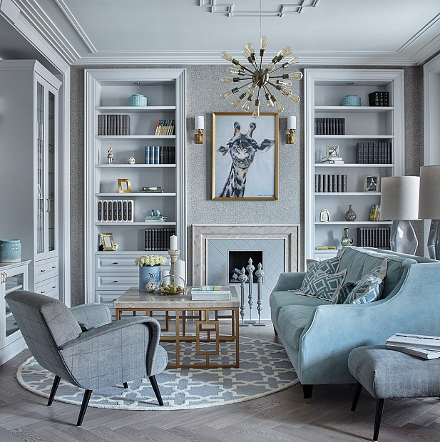 Игровой эксперимент с неоклассикой в просторной квартире для семьи с ребенком. Интересный дизайнерский ход проекта – сложная планировка, в которой некоторые помещения остаются единым пространством, но при этом функционально и визуально разграничены на зоны. Так, кухня и гостиная перемежаются декоративным порталом, а в спальне зона для сна отделена от уголка для чтения с козеткой и стеллажом для книг. В детской также условно выделены две части — игровое пространство с рабочим столом и уютная ниша с кроватью в обрамлении декоративных штор. Обилие ниш в квартире использовано для встроенной мебели и украшения помещения. Например, в гостиной по бокам от каминного портала в нишах расположены шкафы для книг и вещей, а ниша в прихожей с консольным столом, фотографиями и картиной создает домашнее настроение при входе в квартиру. Колористика и узоры в каждой комнате, мебель на заказ по авторским чертежам и картины с эмоциональными сюжетами создают максимально персонифицированную под вкусы хозяев атмосферу.