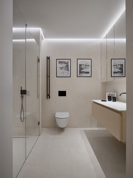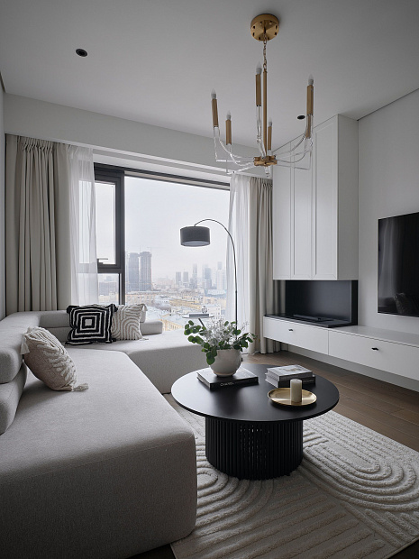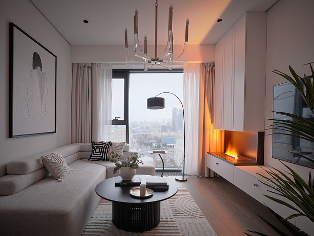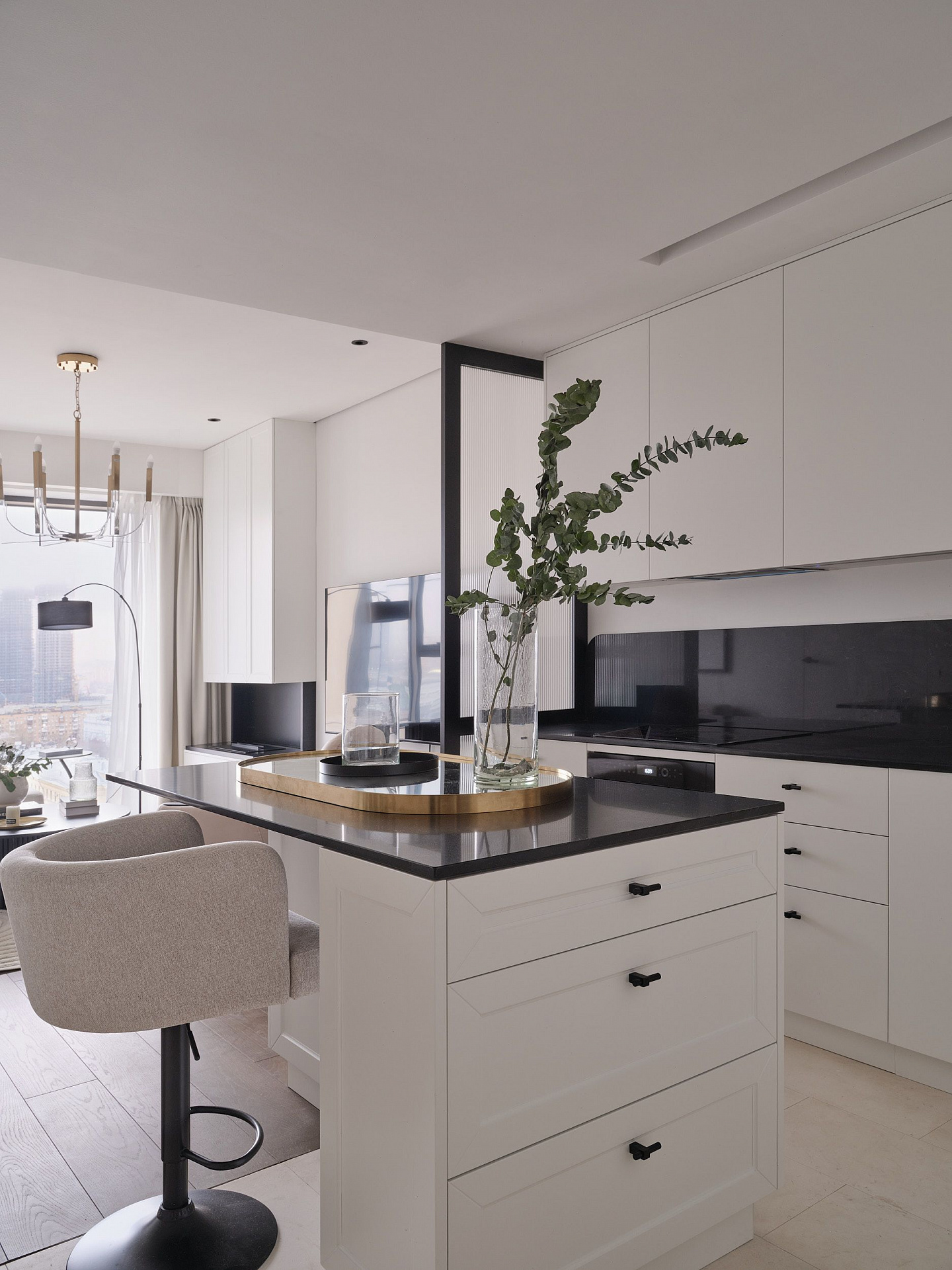 Общая зона кухни-гостиной зрительно разделена полупрозрачной стеклянной перегородкой. В гостиной 3d камин, окно с панорамным видом на город и большая тв плазма создают волшебную атмосферу вечером. Вместо обеденного стола на кухне установлен остров с ящиками для хранения.