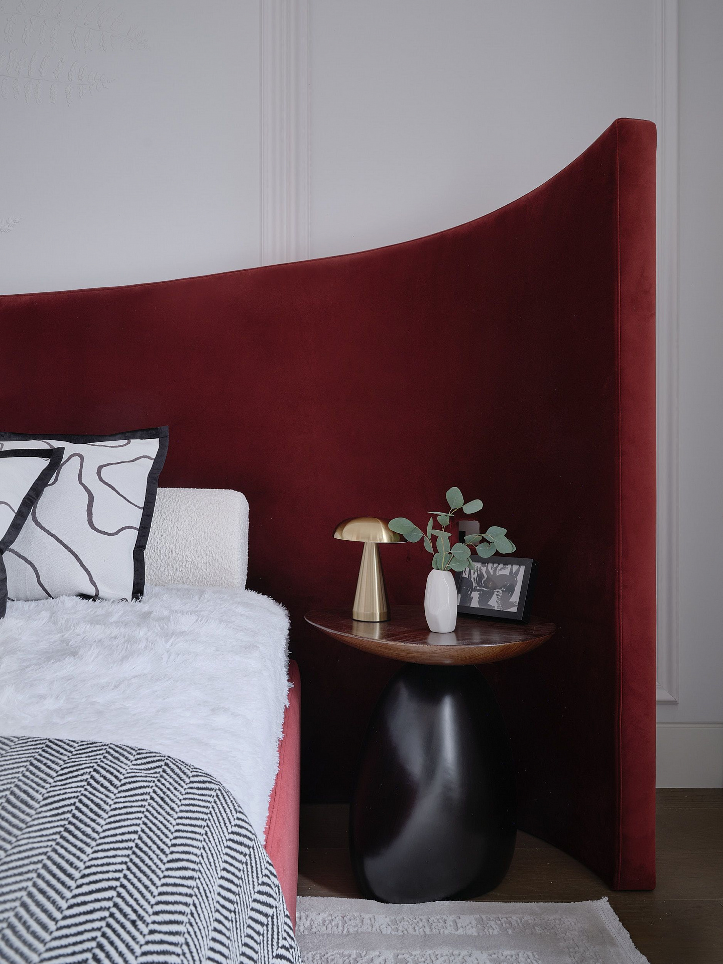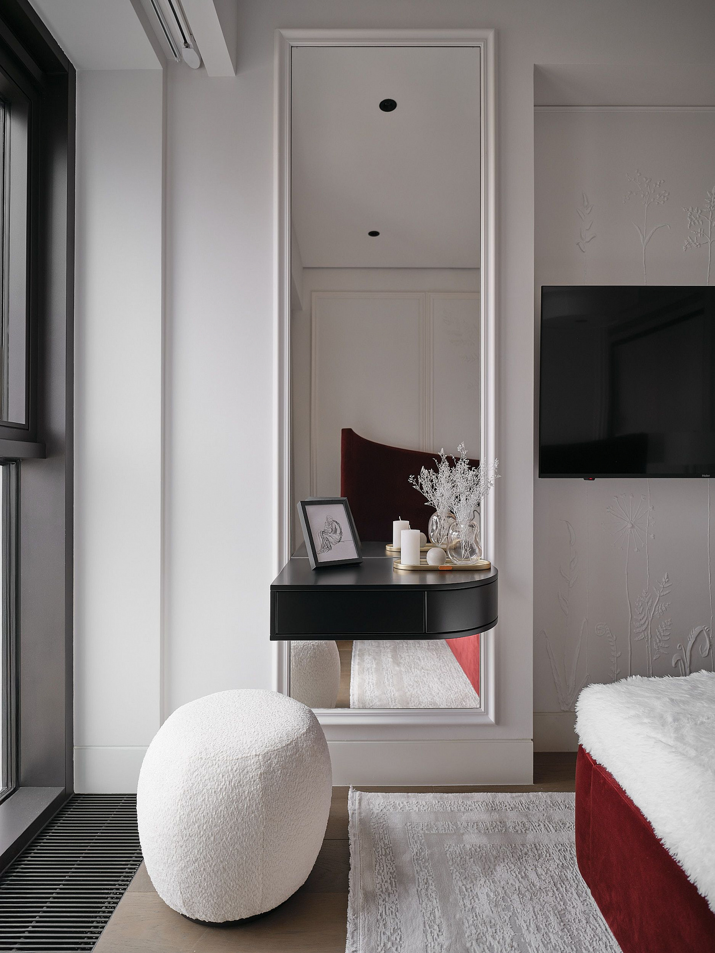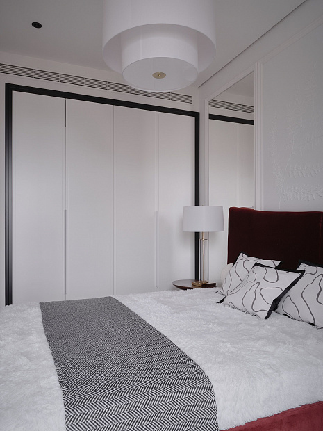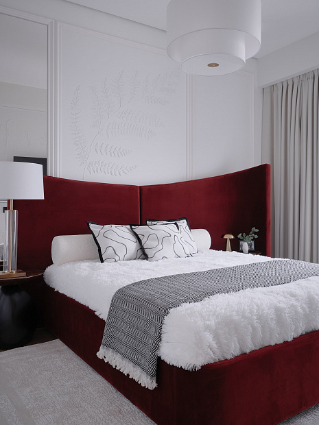 В спальне большой встроенный шкаф с зеркалами на дверях, а главный ее элемент – большая кровать с радиусным изголовьем сочного бордового цвета.