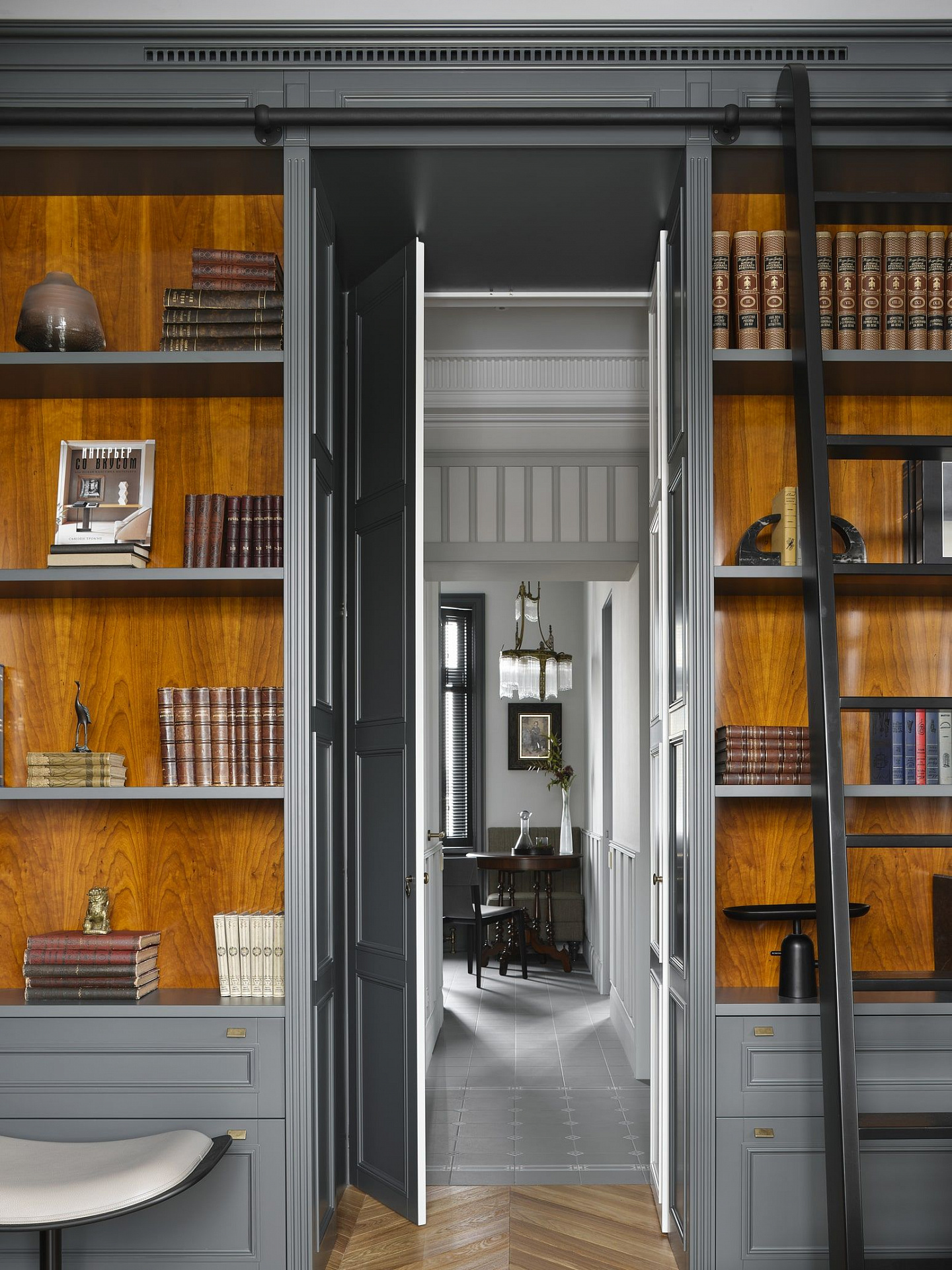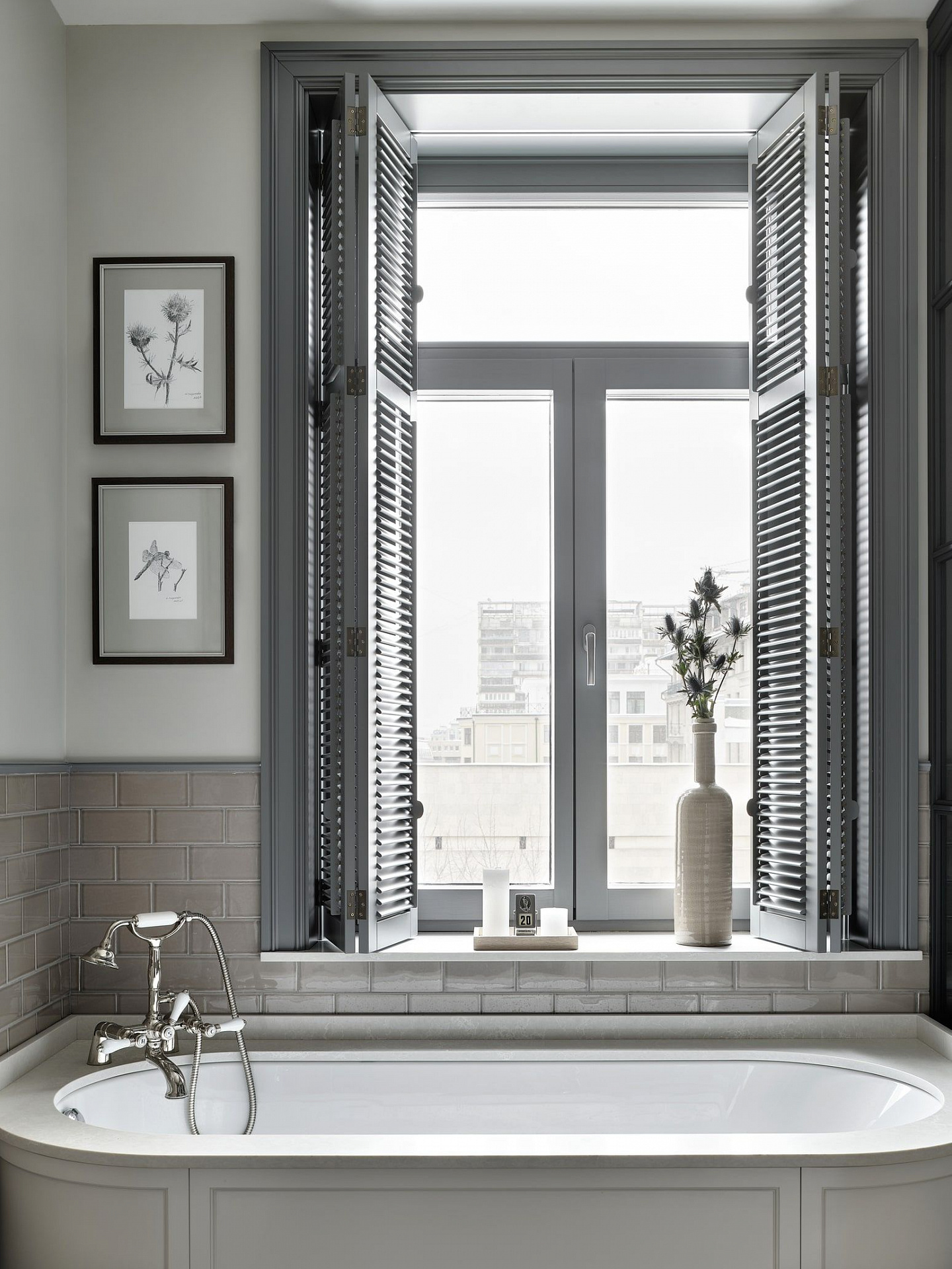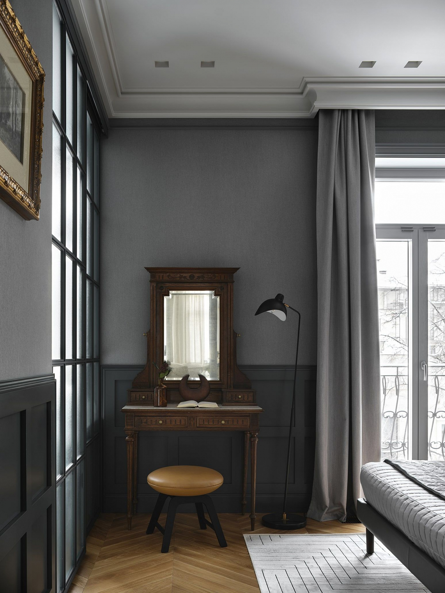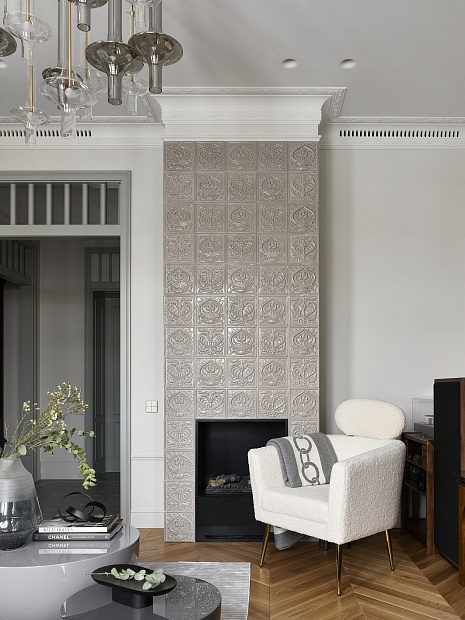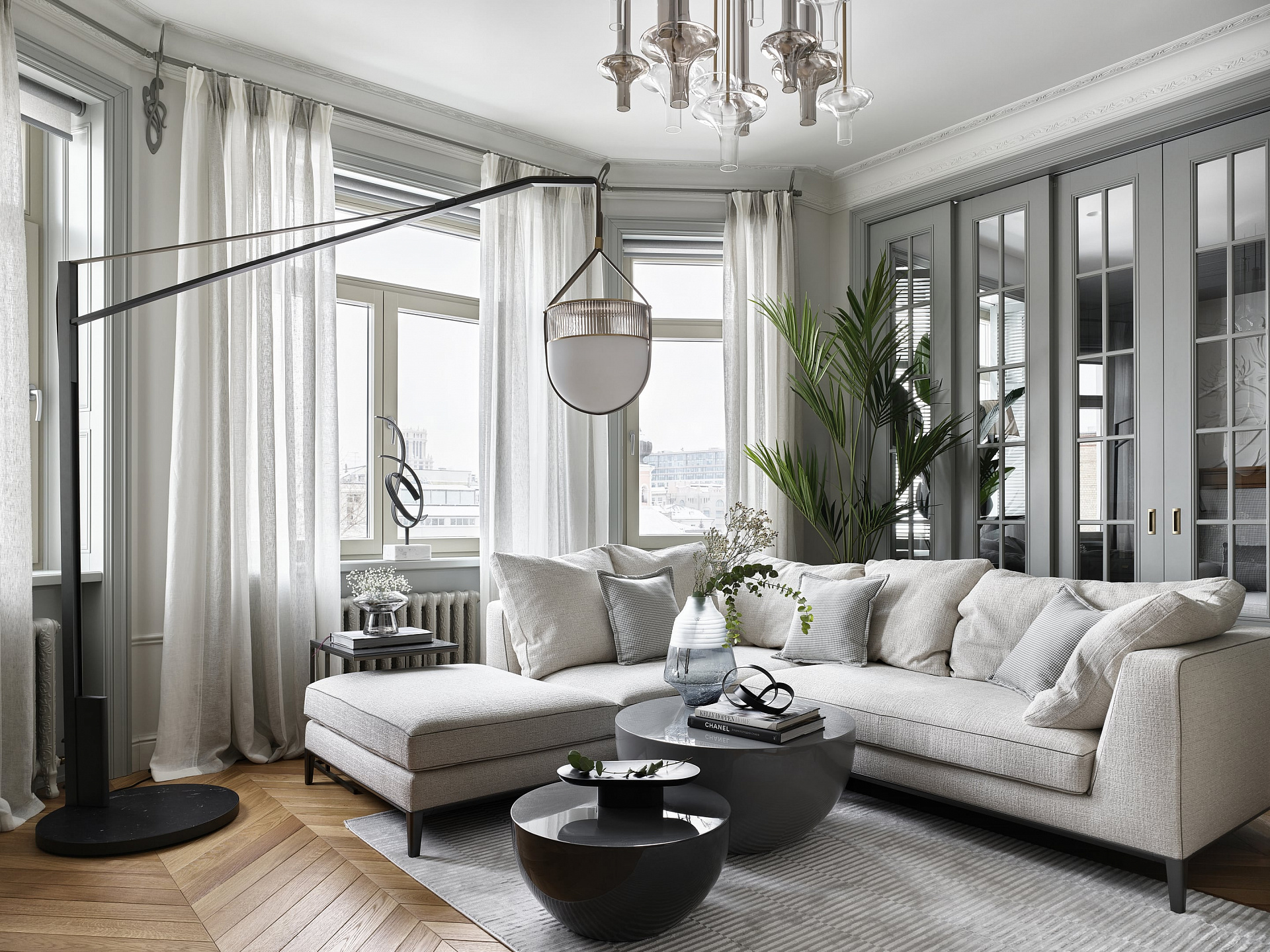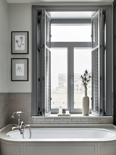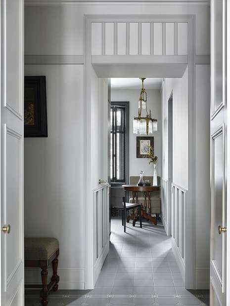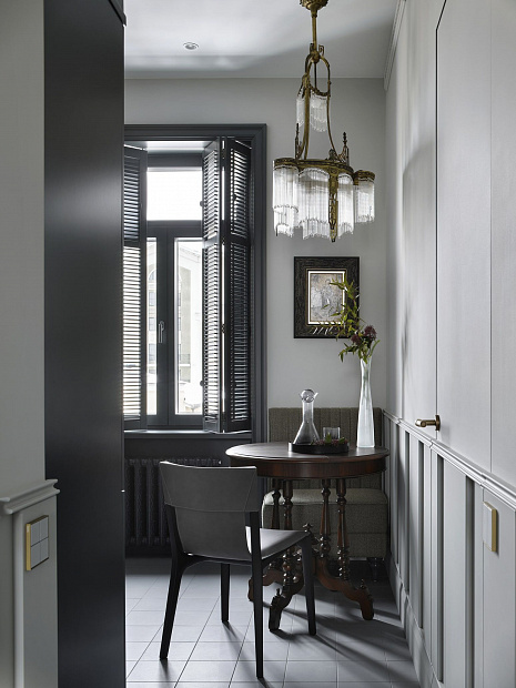 Дизайн выполнен в скандинавском стиле с элементами традиционной английской классики в холодных приглушенных тонах. Эклектика прослеживается и в сочетании современной и антикварной мебели и предметов декора.