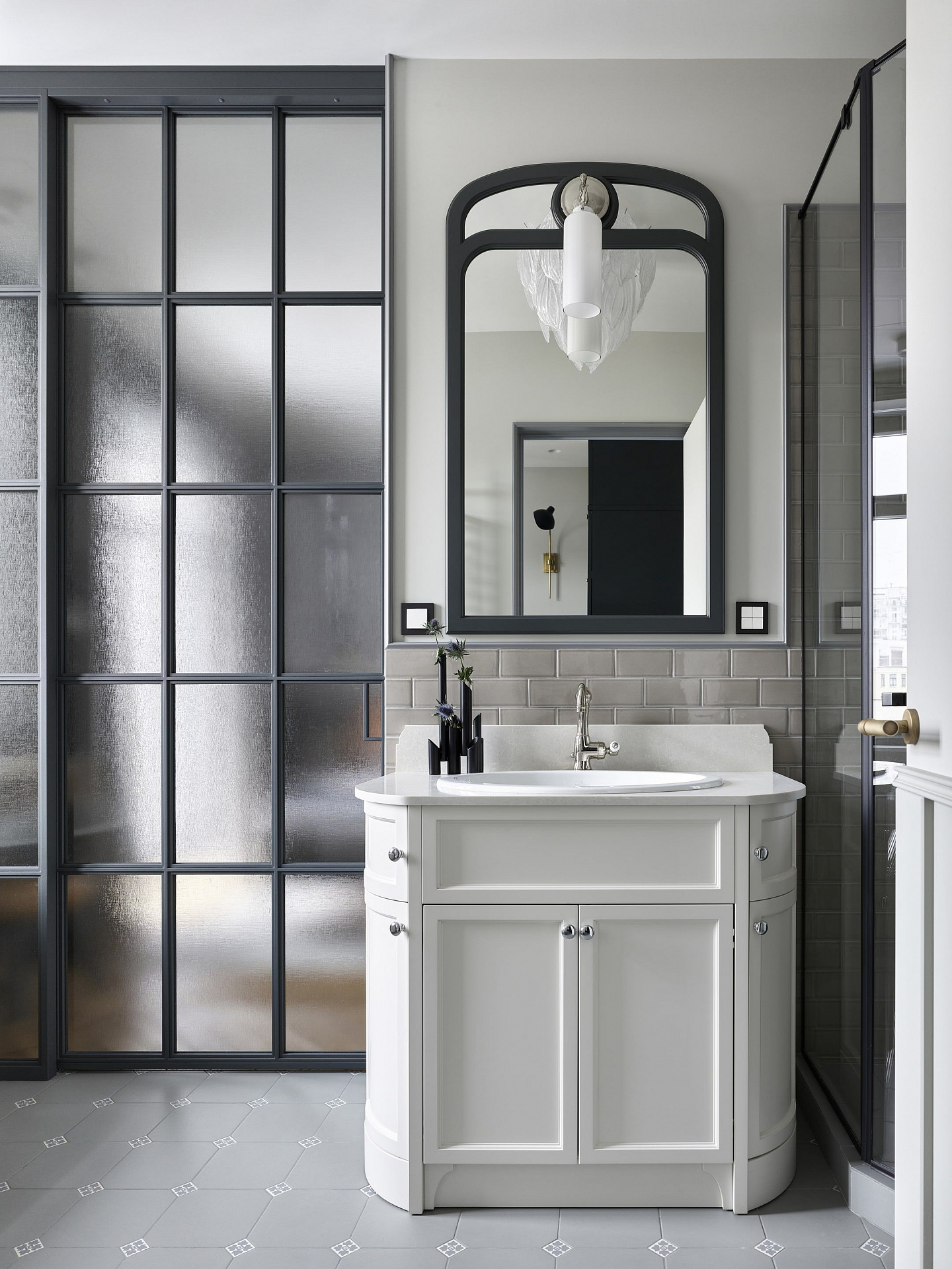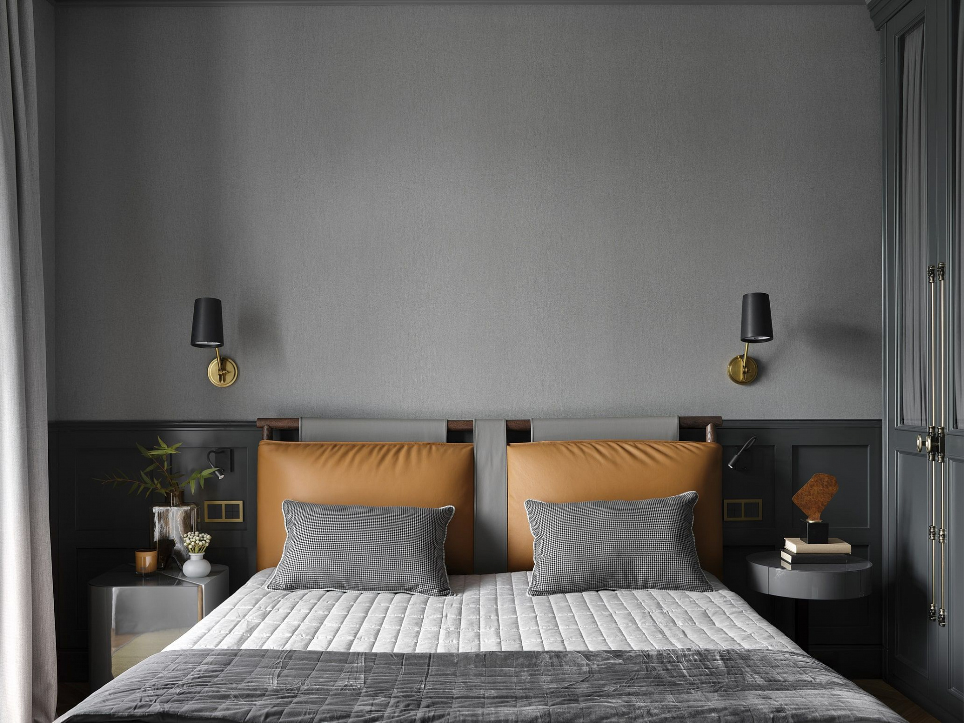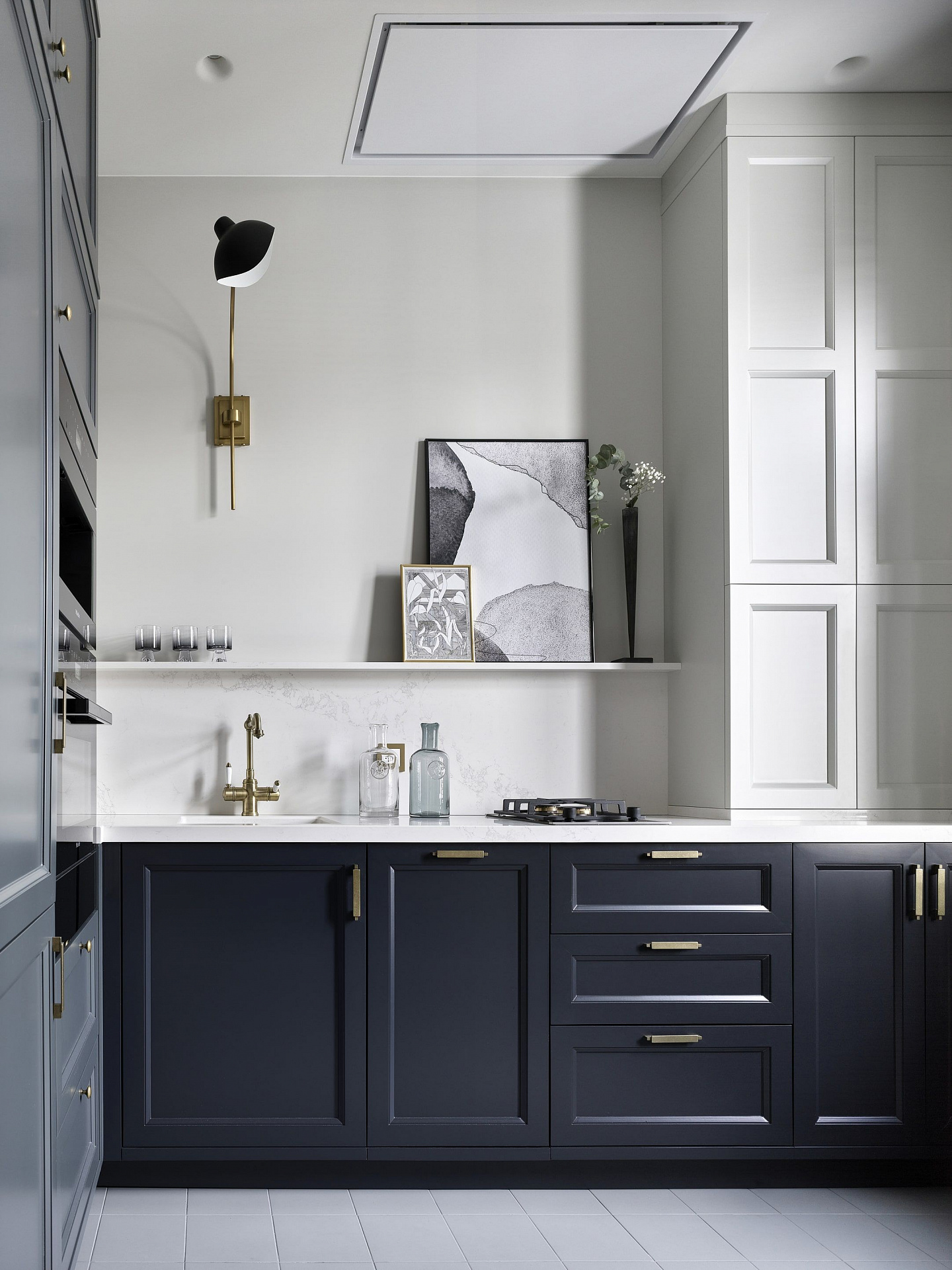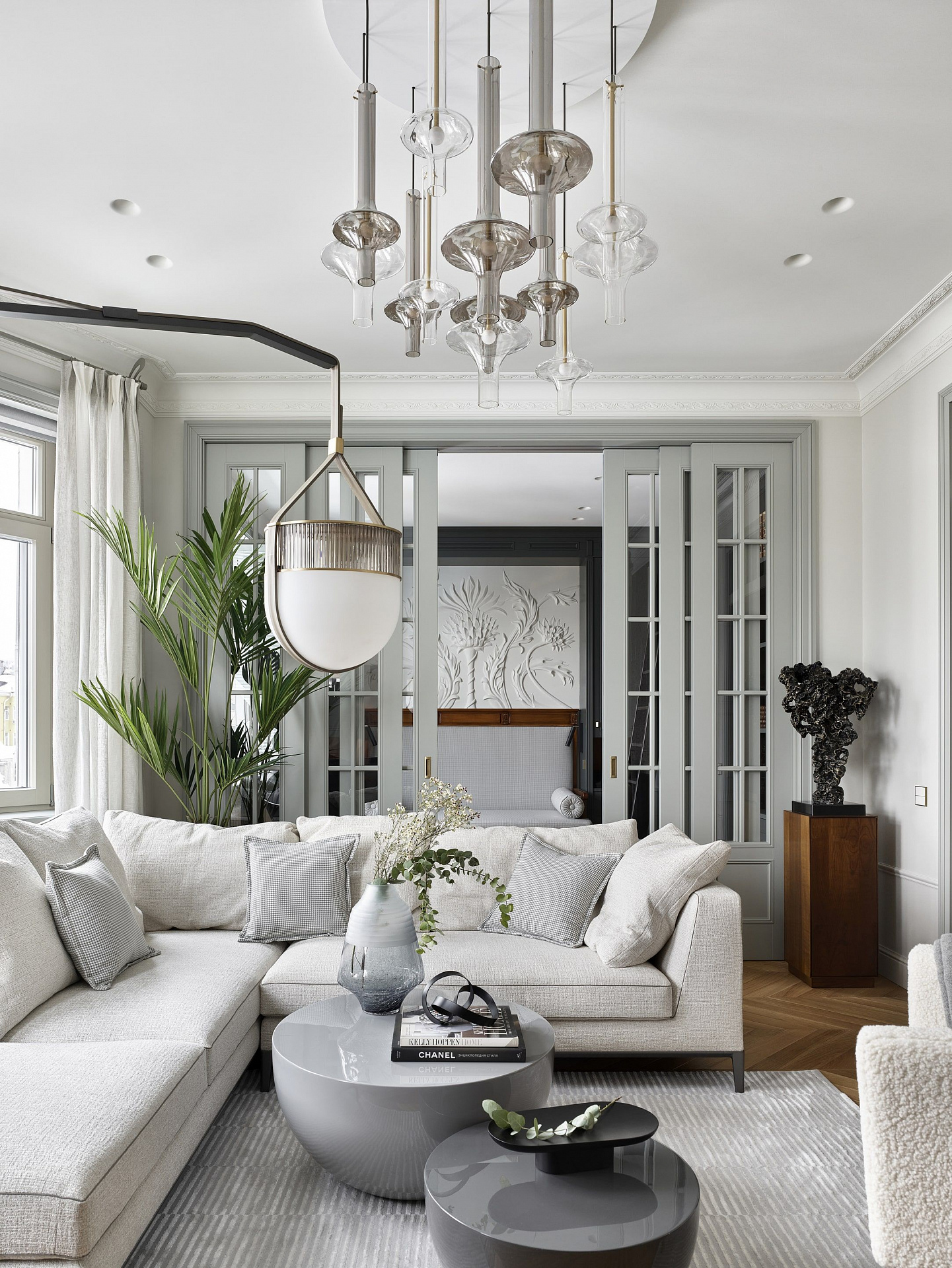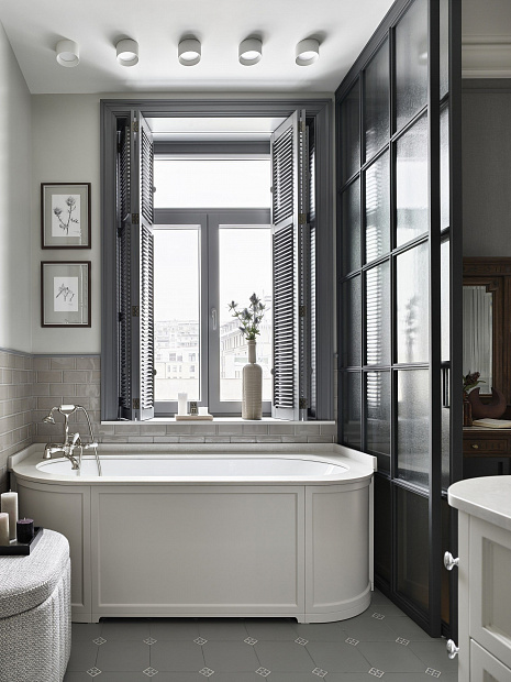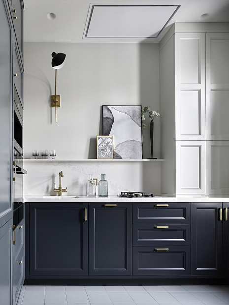Дизайн выполнен в скандинавском стиле с элементами традиционной английской классики в холодных приглушенных тонах. Эклектика прослеживается и в сочетании современной и антикварной мебели и предметов декора.