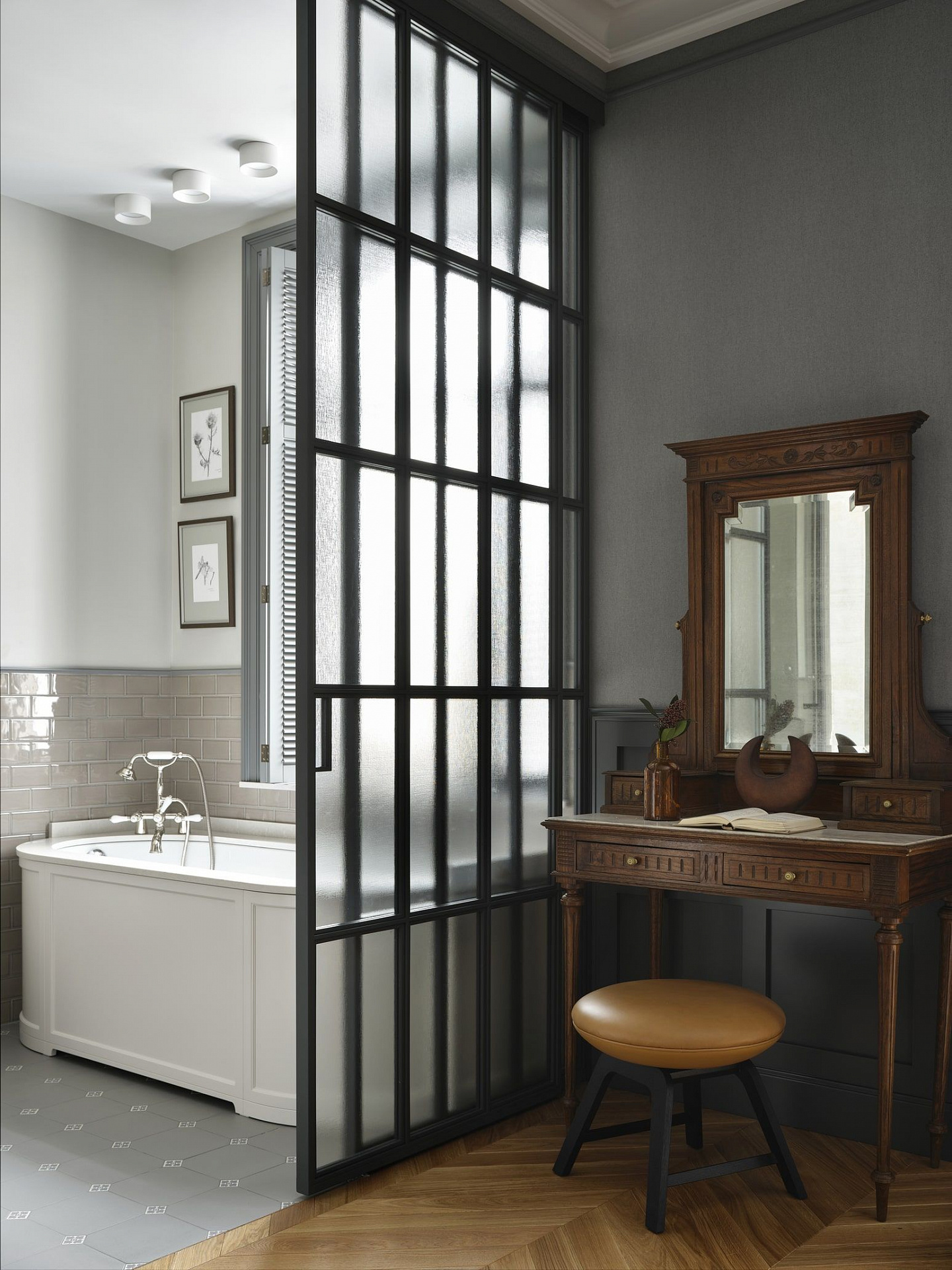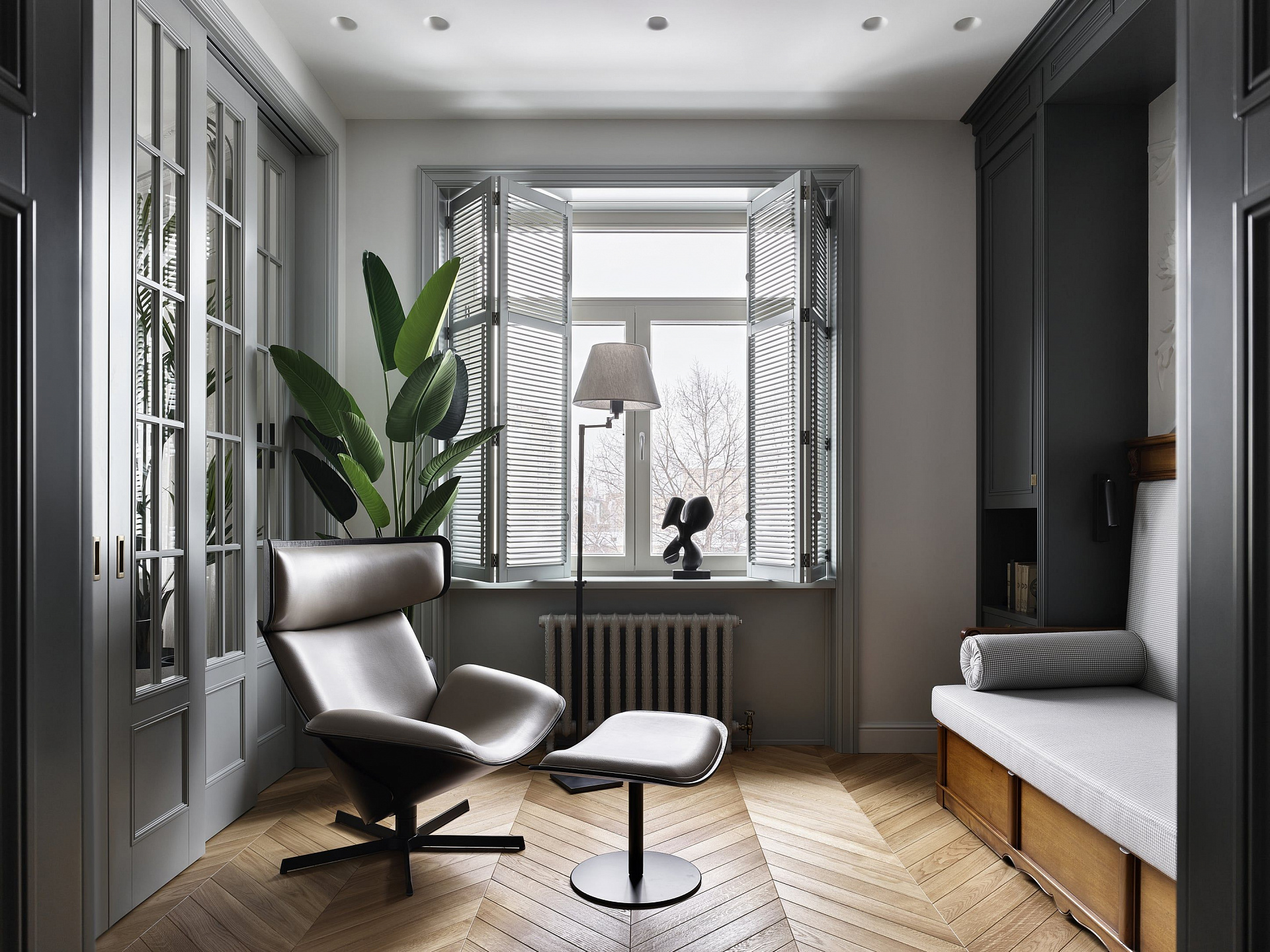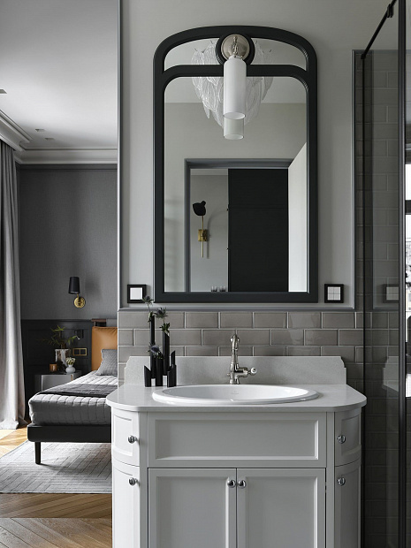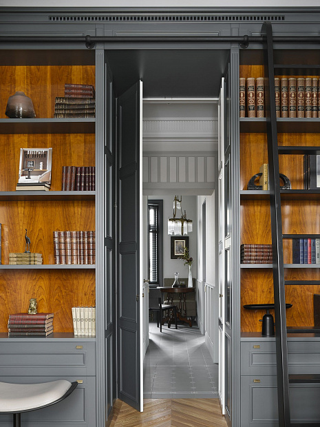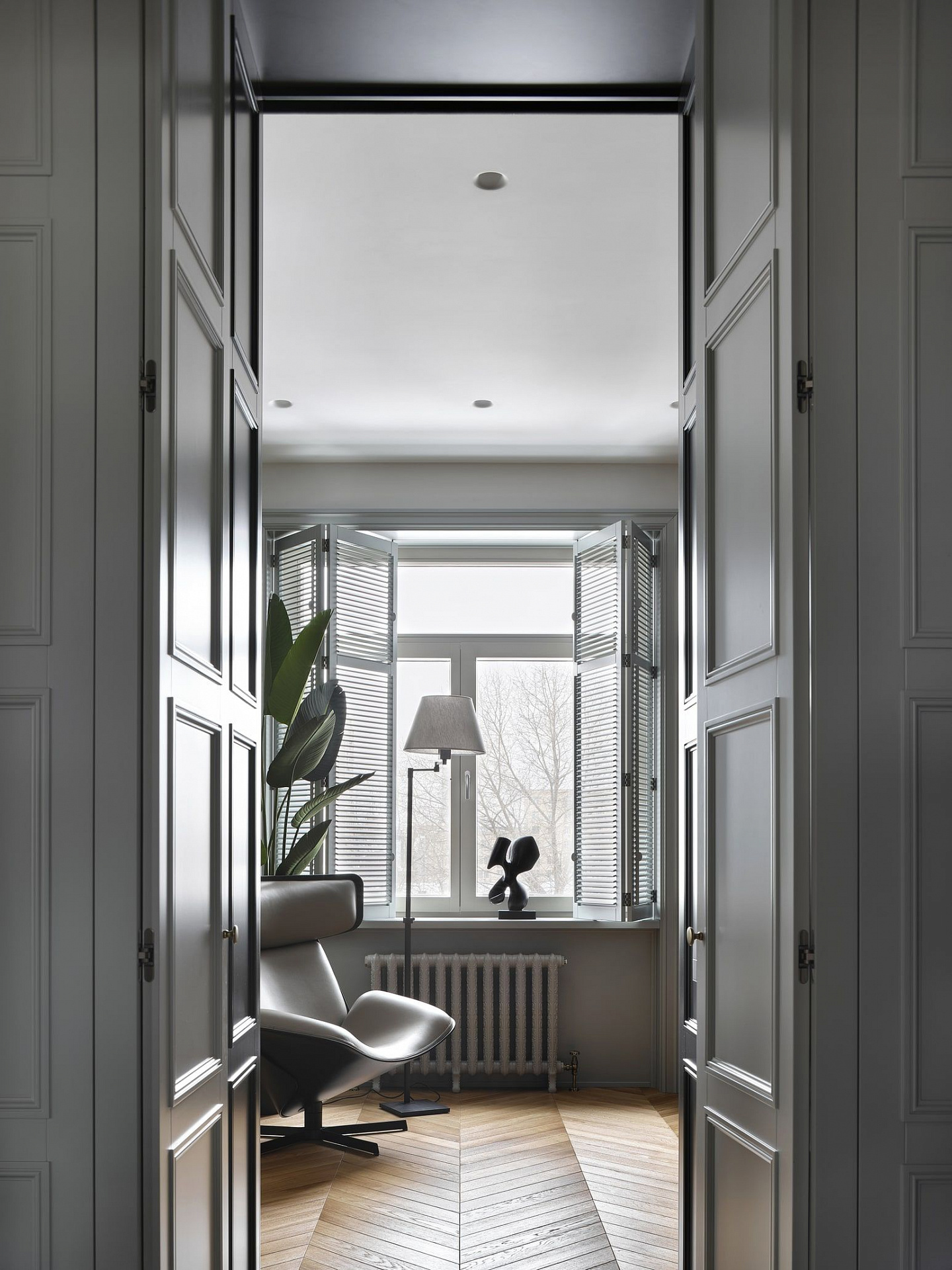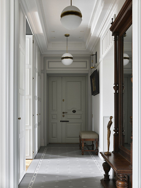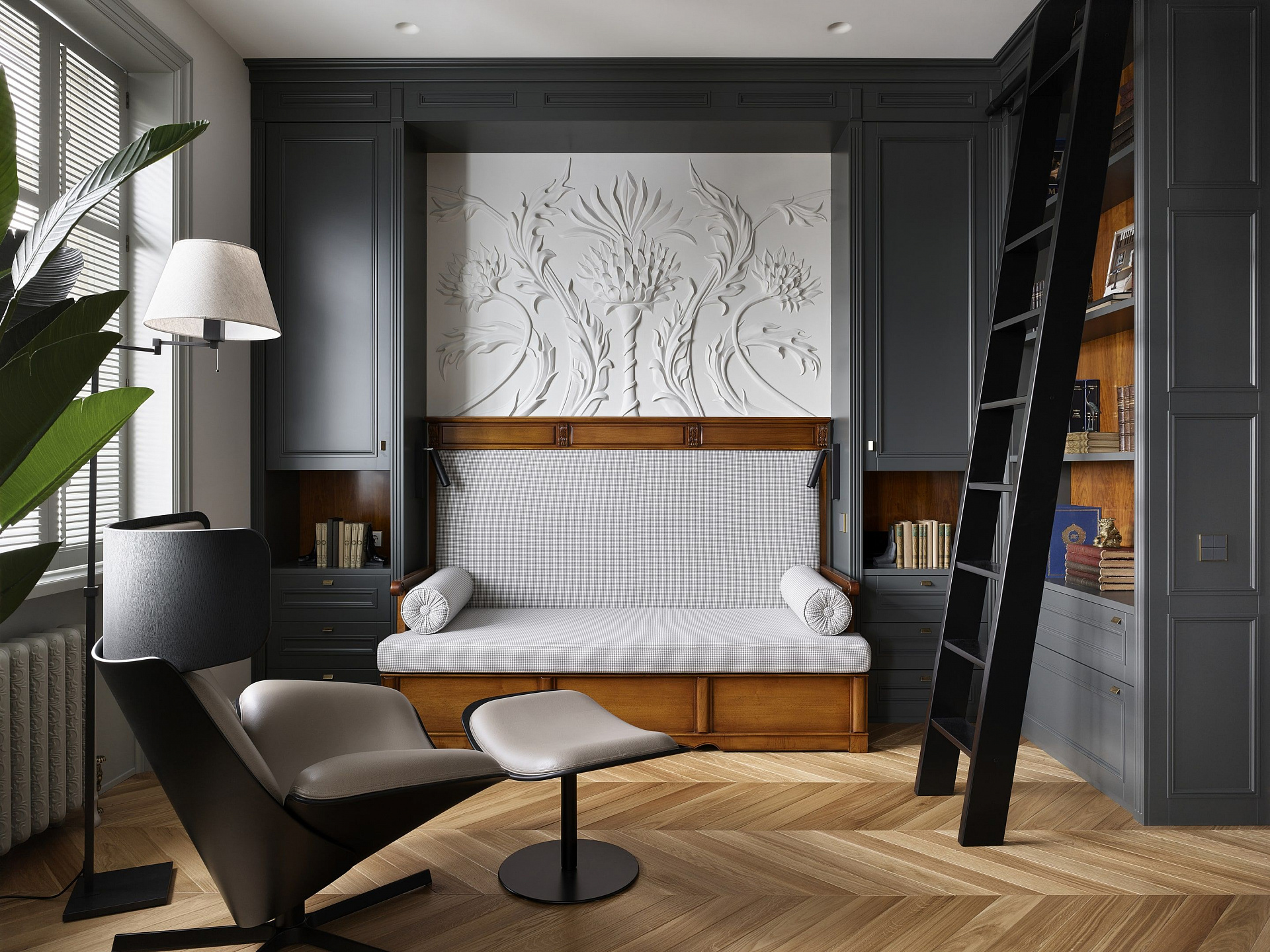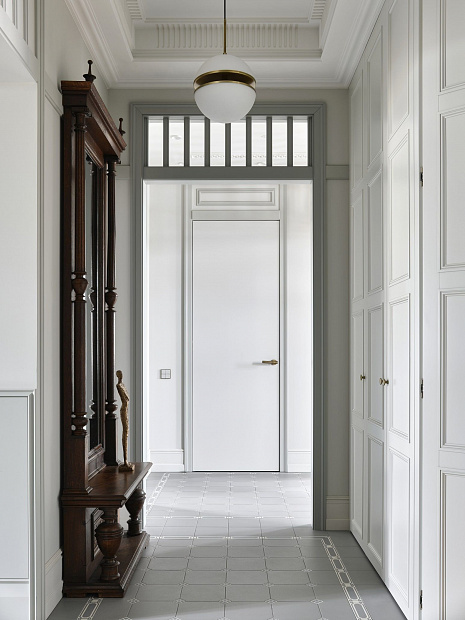 Трехкомнатная квартира в историческом районе Москвы стала мечтой для своих хозяев. Ремонт осложнялся планировкой старого дома с несущими стенами. Владельцам хотелось добавить объема в жилье, поэтому было найдено уникальное планировочное решение – сделать квартиру-трансформер, где по желанию можно изолировать комнаты, либо создавать единое помещение. Так, объединили кабинет с прихожей, а спальню с санузлом раздвижными дверями. Пространство между прихожей и кабинетом сохранили, создав вместо стены искусственную перегородку из мебельной композиции.