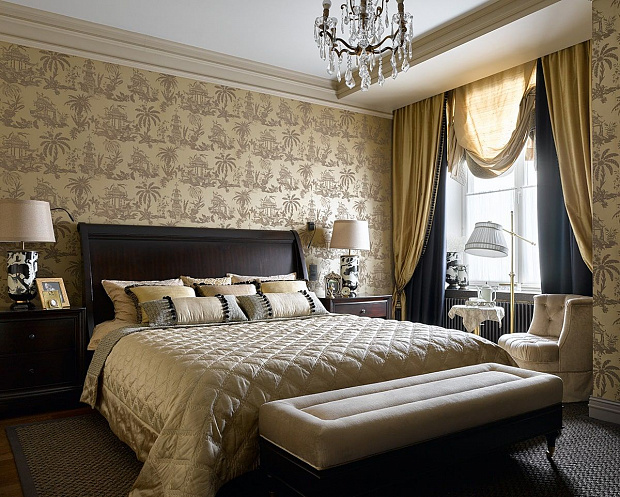 В целом монохромный в темных оттенках интерьер разбавлен яркими акцентами красного цвета в текстиле и элементами на постерах. Китч обыгран в ироничной интерпретации «зарисовок про Бэтмена» на картинах, в журнальном столике в виде чемодана и занятном рисунке прикроватных ламп. Декоративные элементы подобраны таким образом, что при желании их легко заменить и получится новый «сюжет».