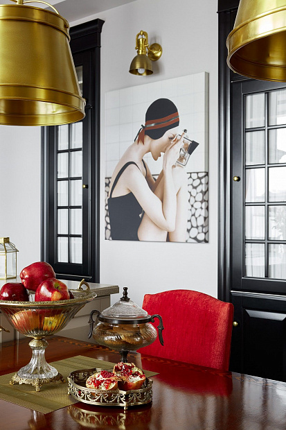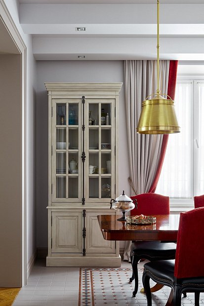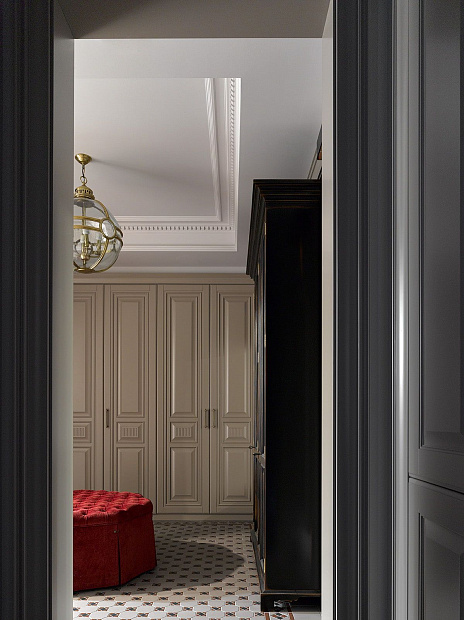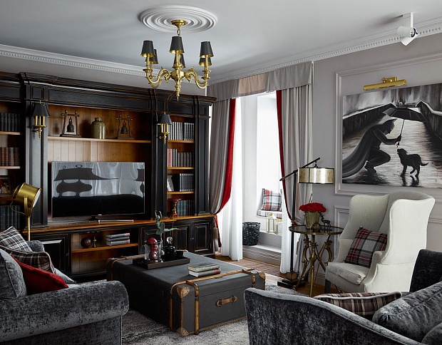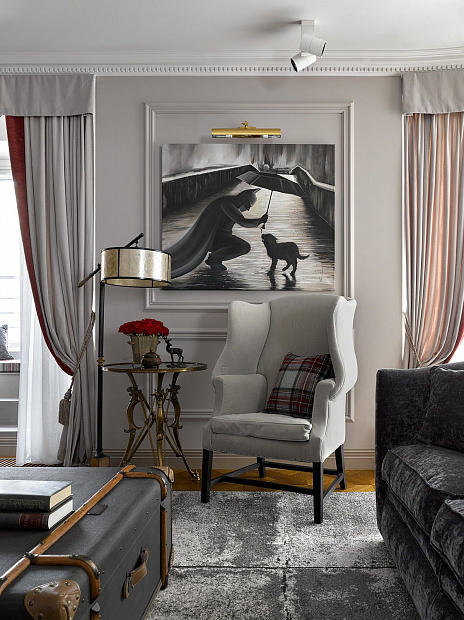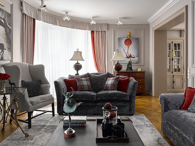 Просторная 4-комнатная квартира в новом жилом комплексе в Санкт-Петербурге была куплена семейной парой для командировок. Глава семейства по работе часть времени проводит в северной столице, поэтому жилье стало альтернативой отелям. Запросы у хозяев были разные: он хотел, чтобы стиль был строгим и классическим, она – чтобы непременно присутствовали элементы китча и был красный цвет. Противоречивые пожелания удалось объединить в стиле американской неоклассики.