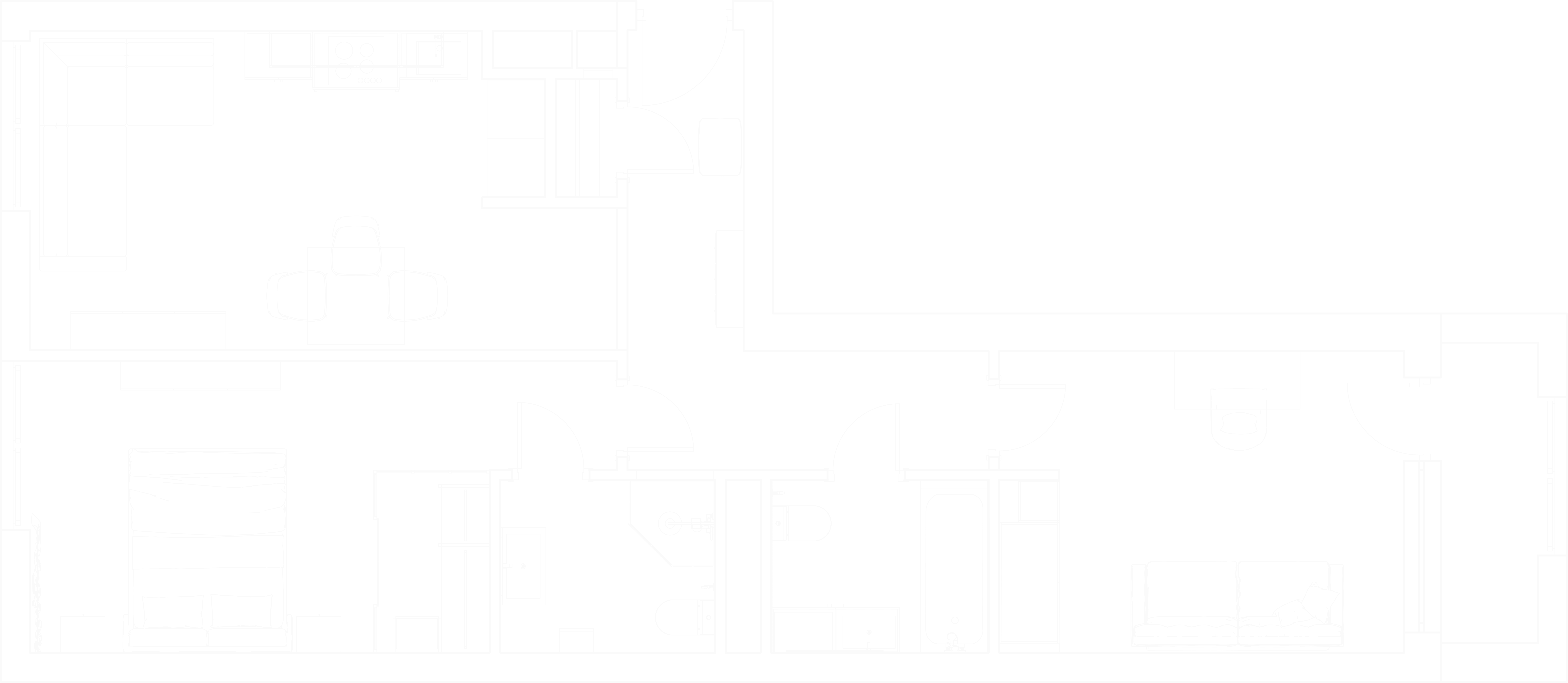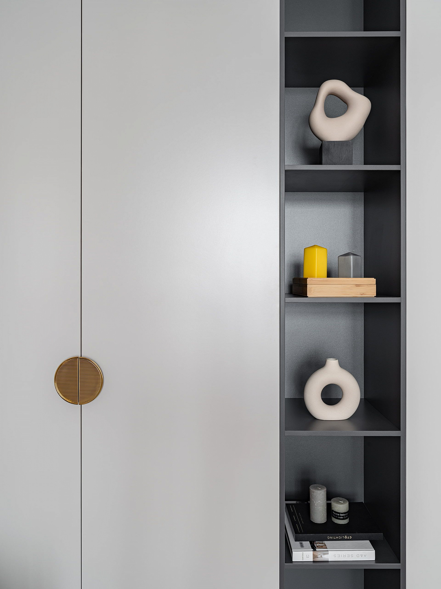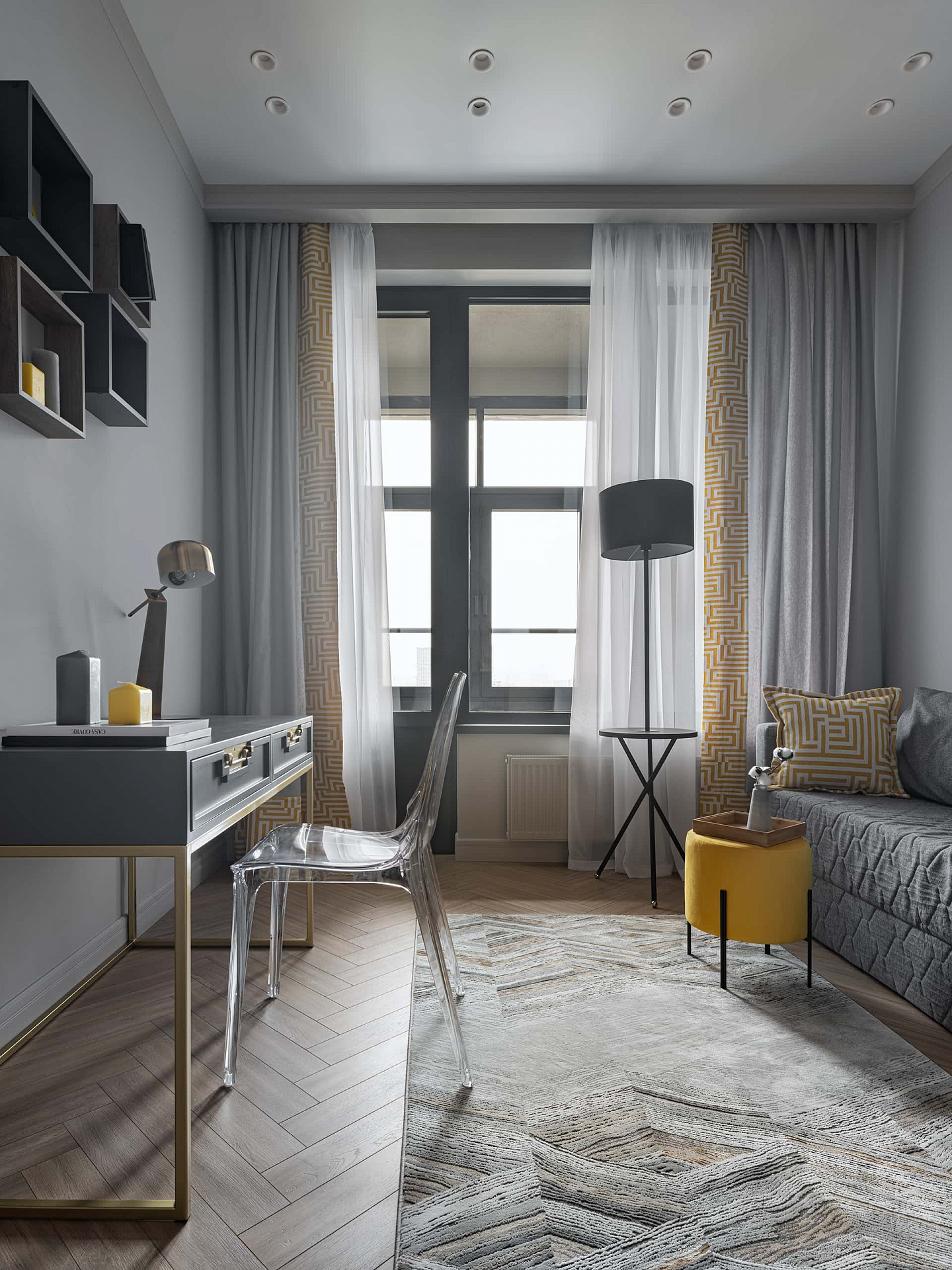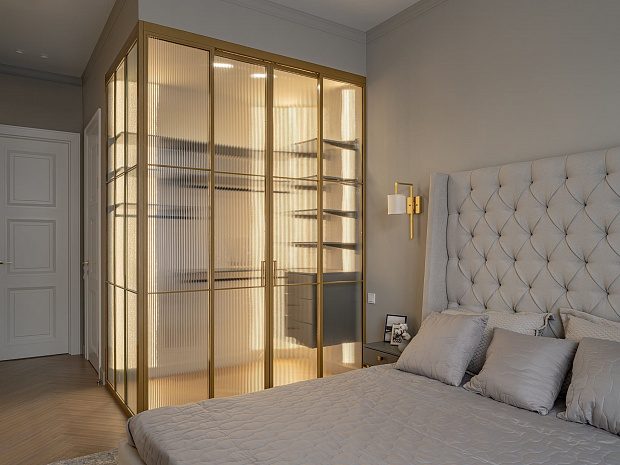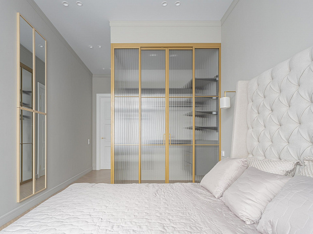 На входе сделана небольшая, но вместительная гардеробная. Еще одну гардеробную в спальне хозяйки было решено выстроить полностью из стеклянных перегородок с подсветкой для восприятия комнаты более легкой и объемной. Большое зеркало напротив стола и скрытая в нише стены часть кухонного гарнитура с техникой визуально делают кухню-гостиную более просторной. Светильники в общих пространствах различных причудливых форм создают игру света и теней на полу и стенах.