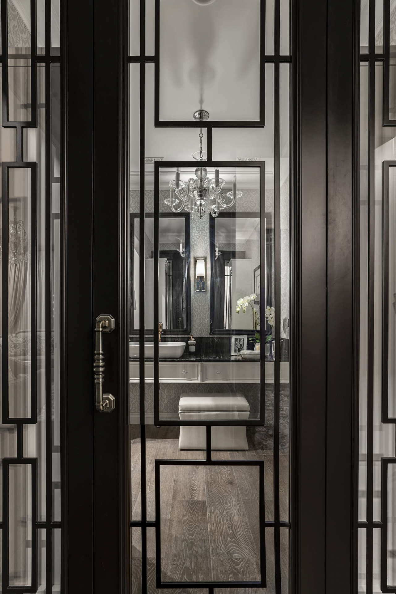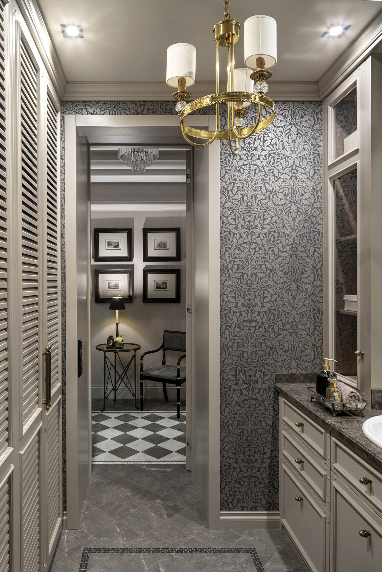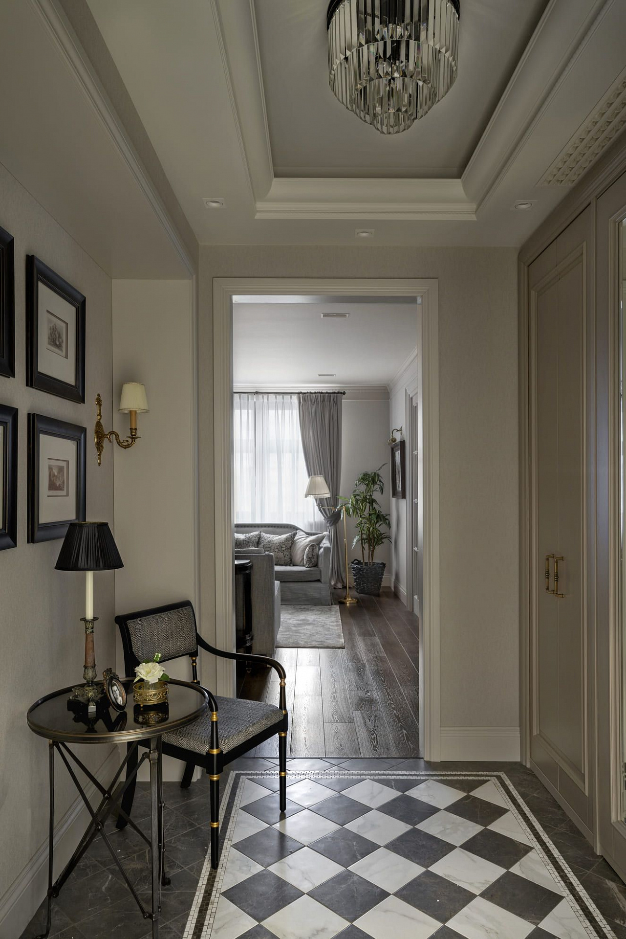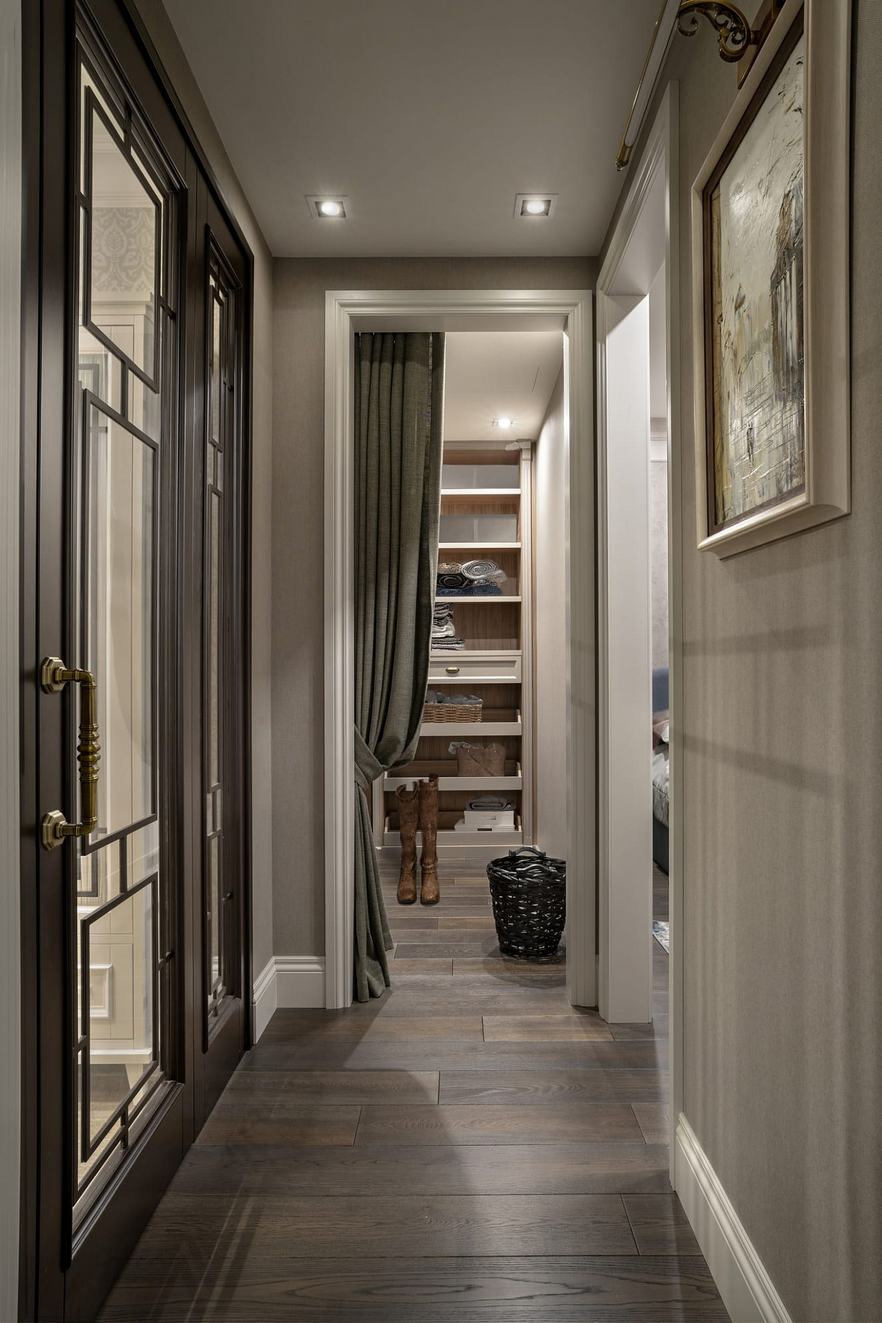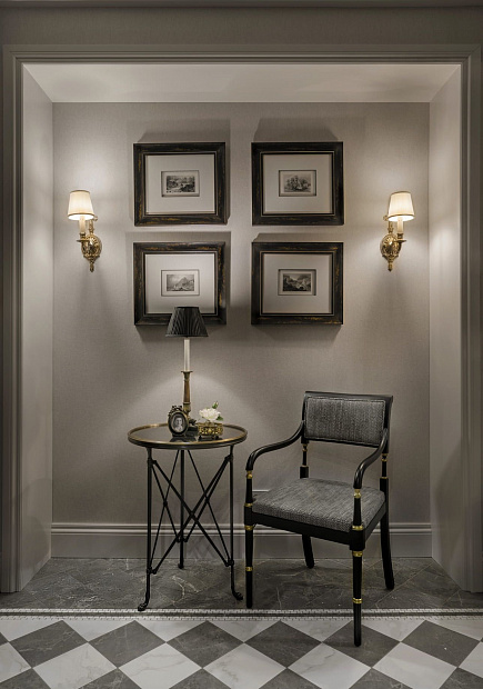 Декоративные стеклянные двери визуально расширяют коридор, ведущий в приватную хозяйскую часть квартиры. В прихожей во всю стену размещен платяной шкаф, одна из дверей которого ведет в гостевой санузел с постирочной зоной. Особое внимание в интерьере уделено искусству. Так, на кухне в рамках помещены распечатки из старинных ботанических журналов, в прихожей – композиция древних гравюр, а в гостиной – картины с историческими изображениями Москвы.