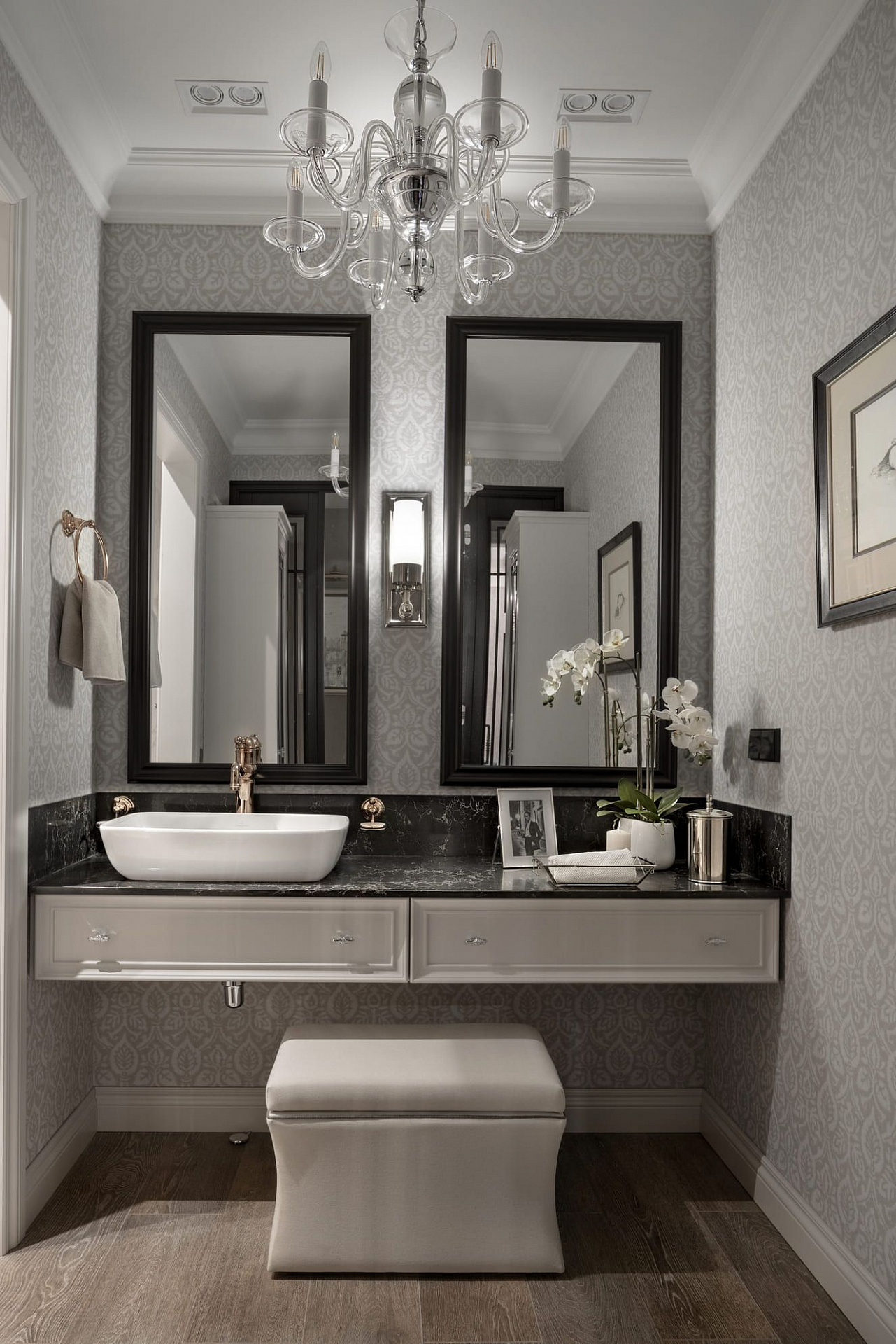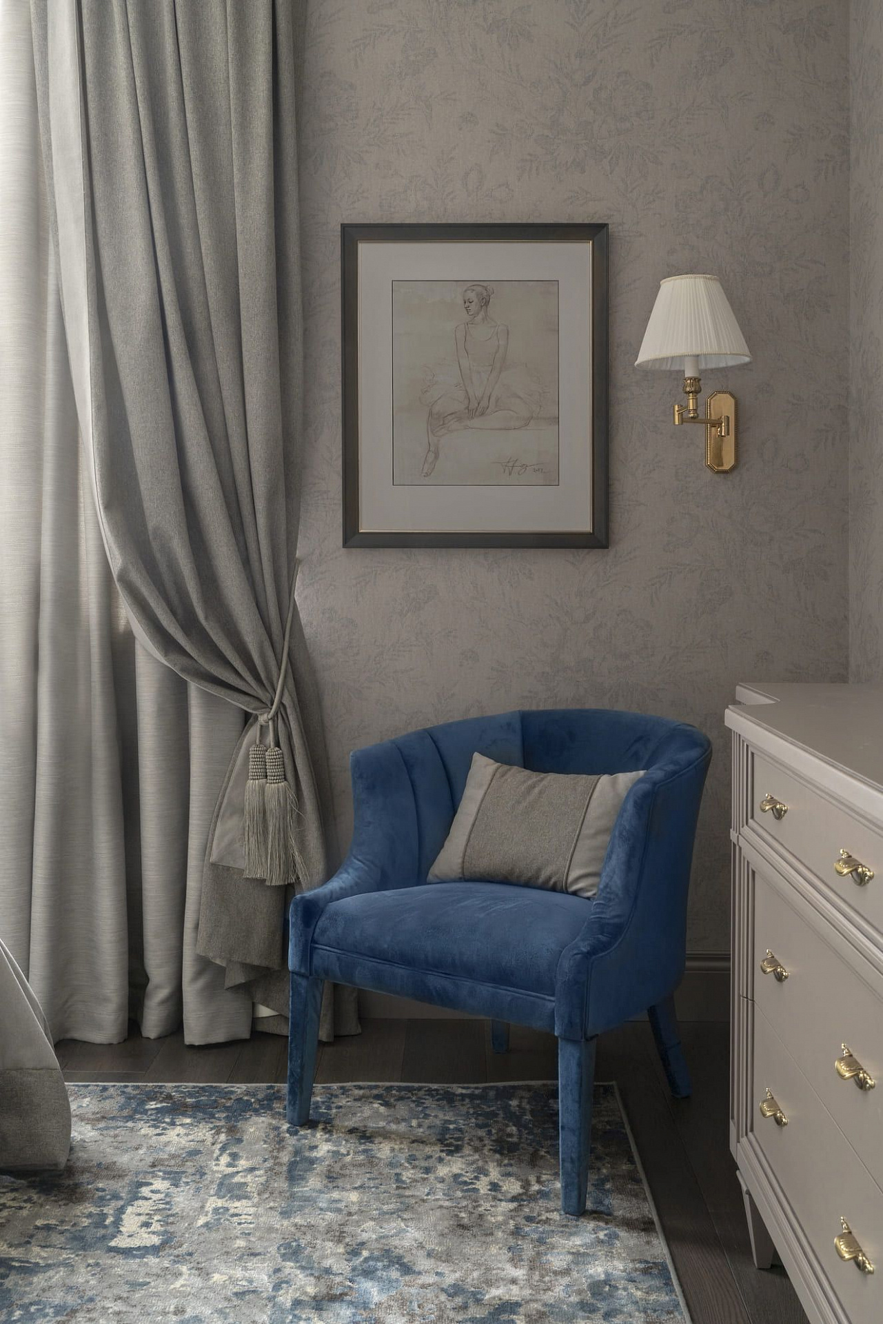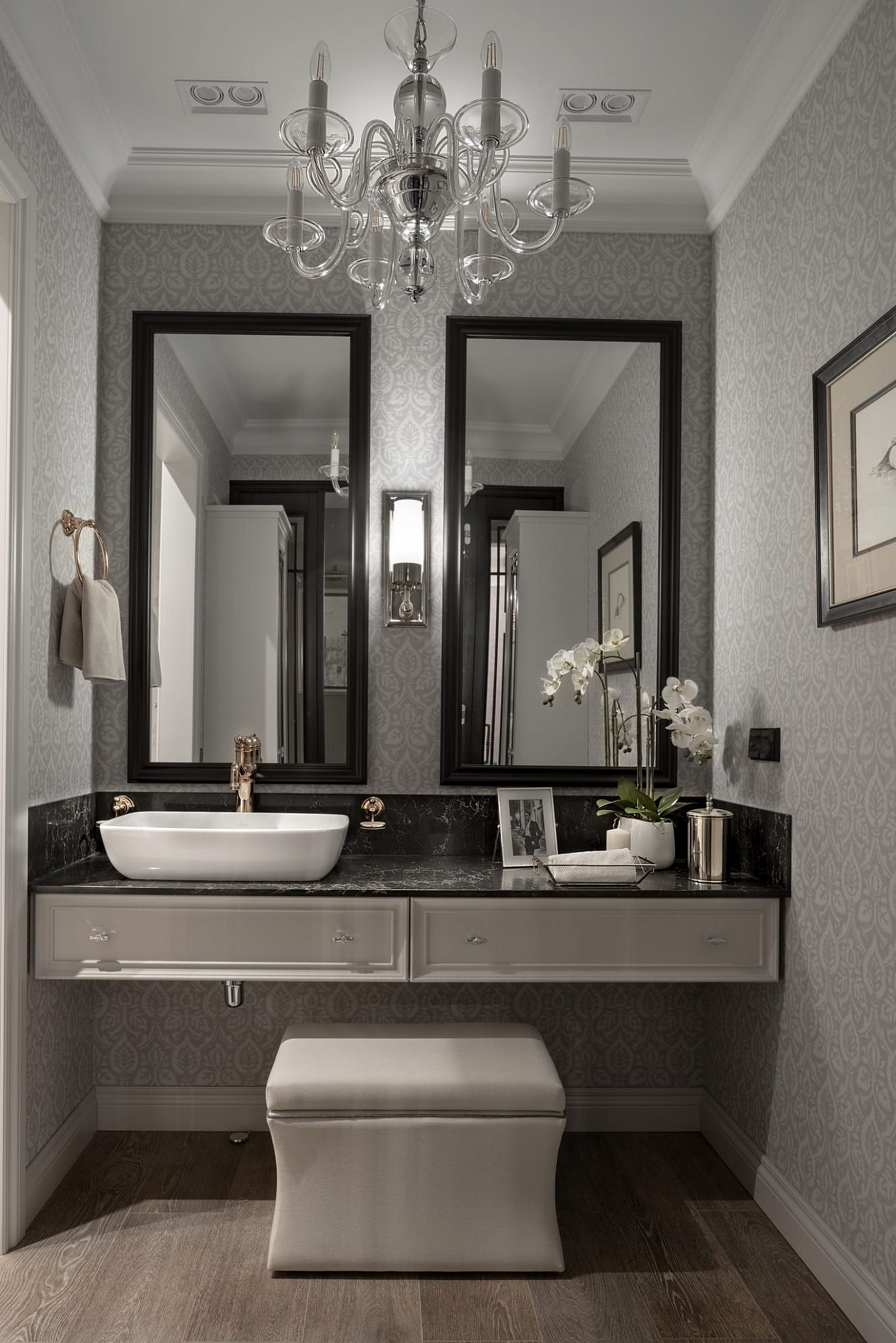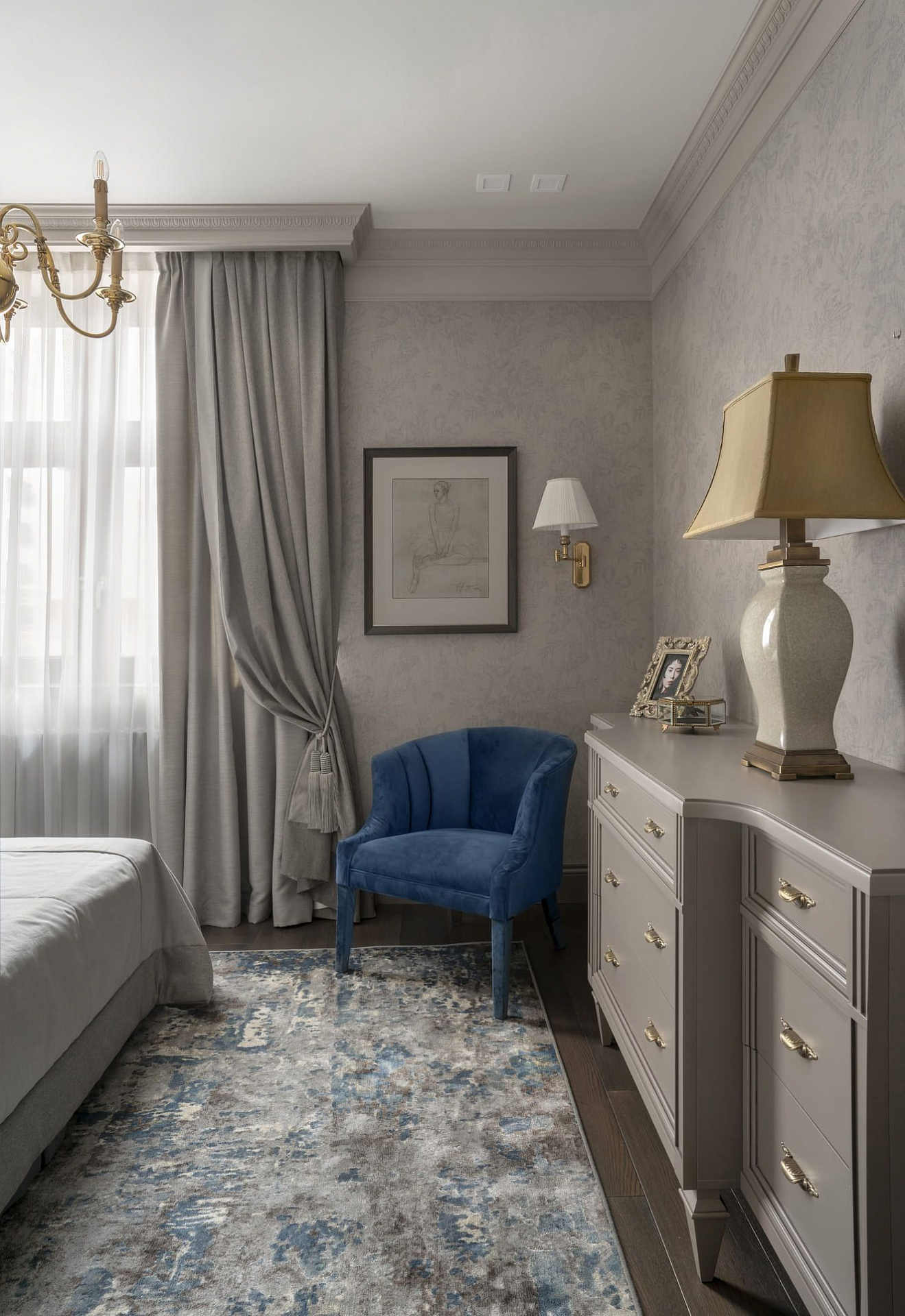 Декоративные стеклянные двери визуально расширяют коридор, ведущий в приватную хозяйскую часть квартиры. В прихожей во всю стену размещен платяной шкаф, одна из дверей которого ведет в гостевой санузел с постирочной зоной. Особое внимание в интерьере уделено искусству. Так, на кухне в рамках помещены распечатки из старинных ботанических журналов, в прихожей – композиция древних гравюр, а в гостиной – картины с историческими изображениями Москвы.