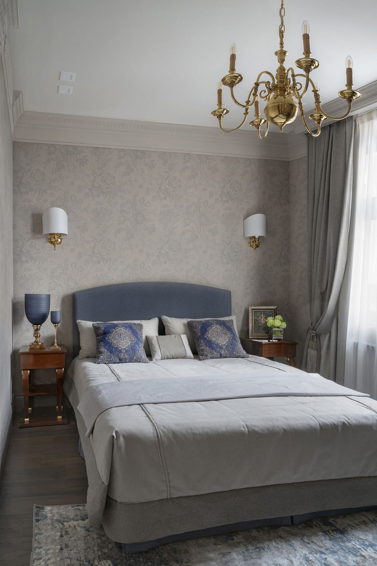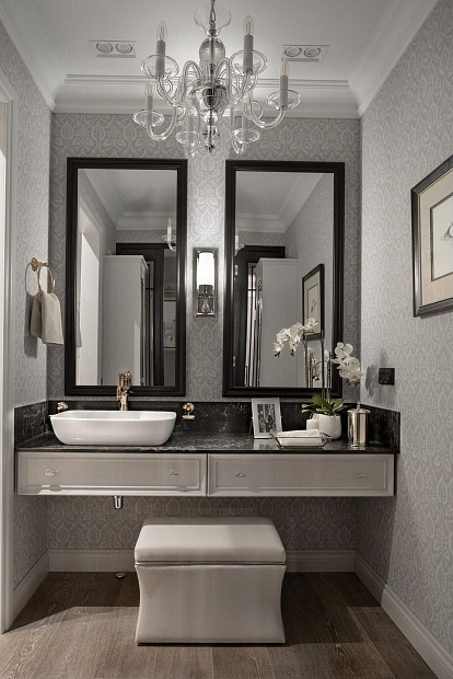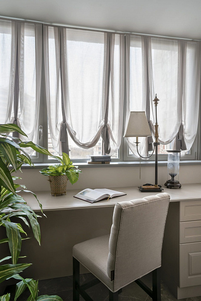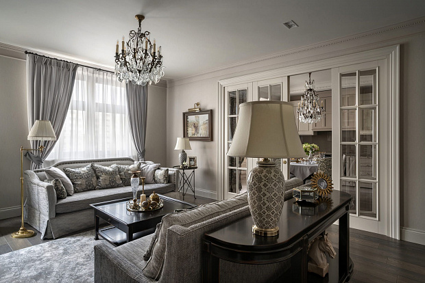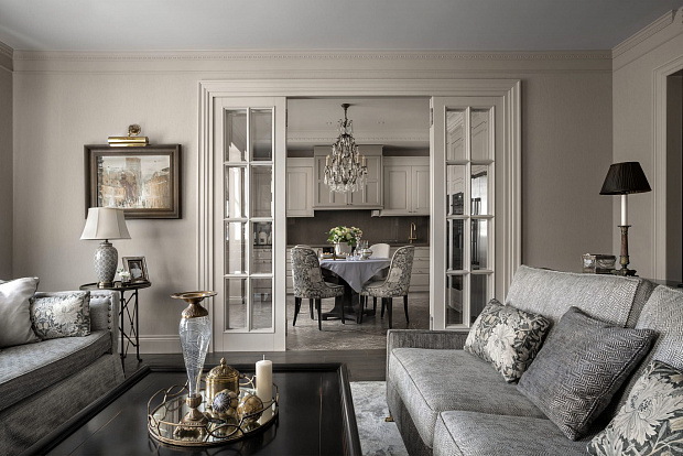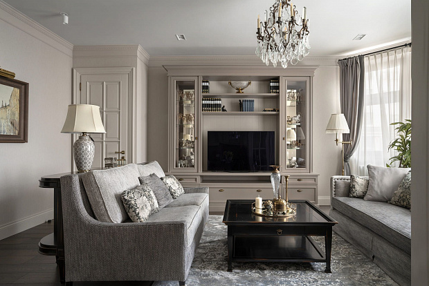 Двухкомнатная квартира для супружеской пары на Серпуховском валу в стиле неоклассики. Кремовый и бежевый тона в интерьере дополнены декоративными акцентами шоколадного и черничного цветов.