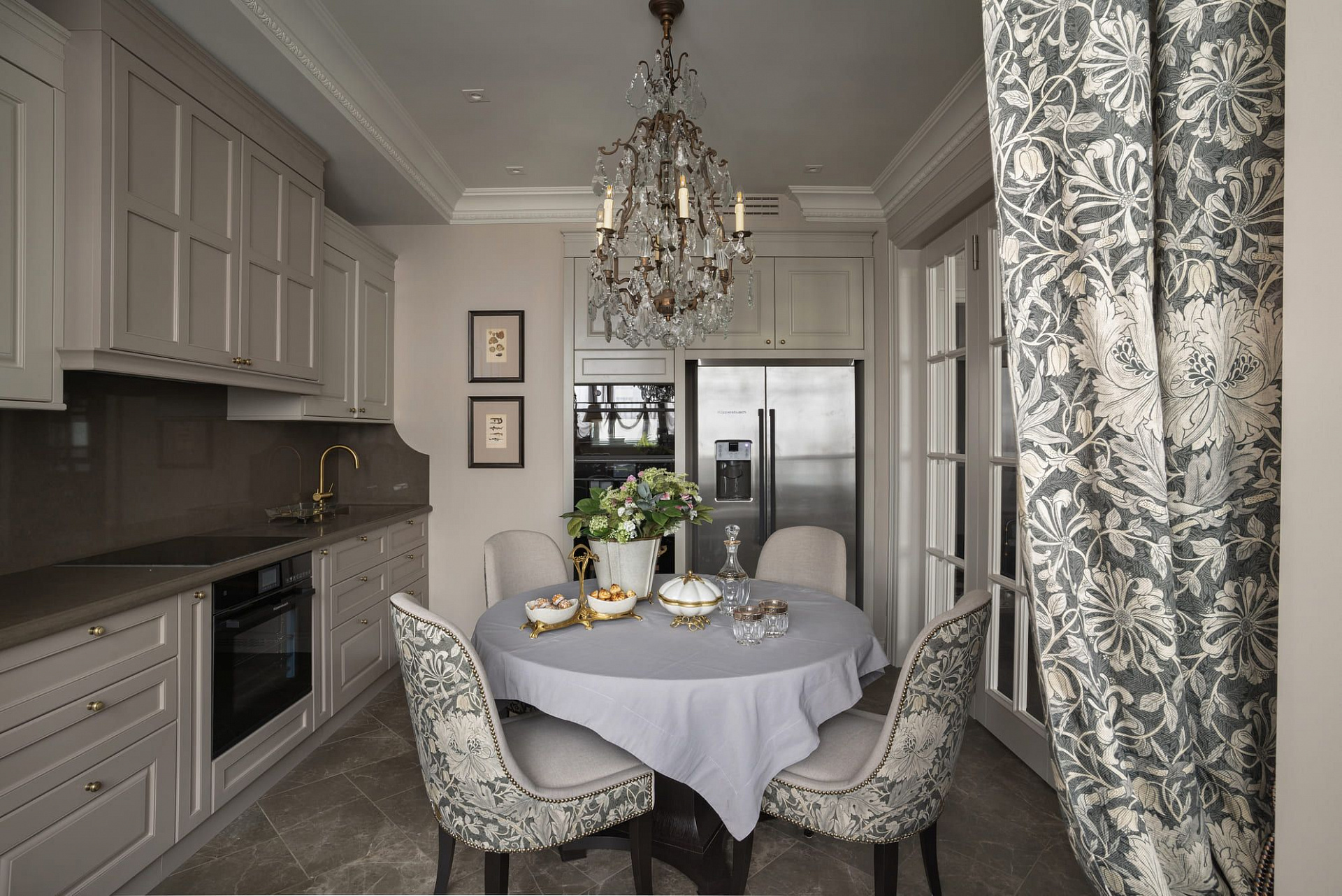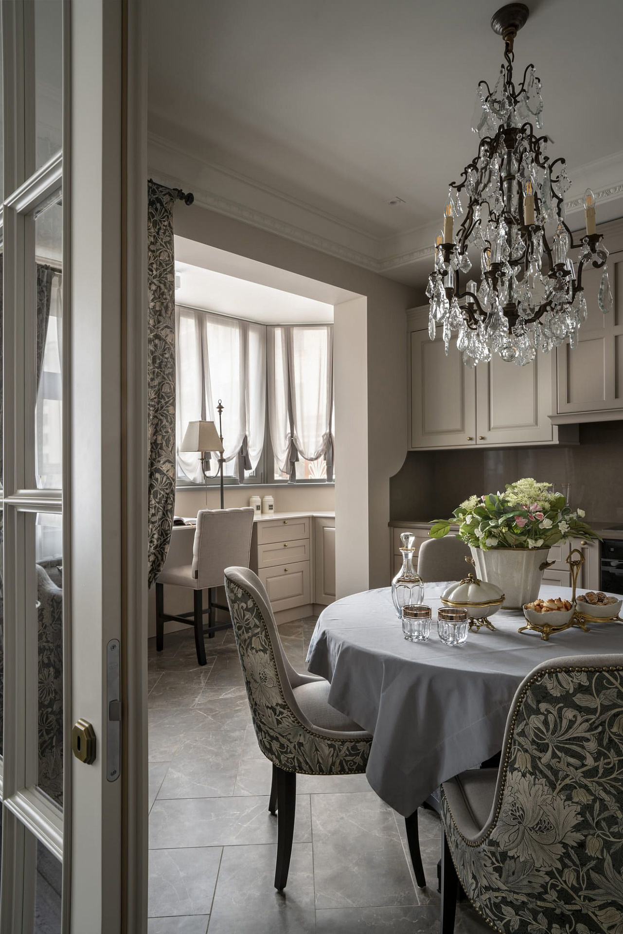 Кухня и гостиная разделены французскими дверьми со складными створками для максимального эффекта общего пространства. Зона у окна обыграна барной стойкой, которая при желании становится рабочей зоной.