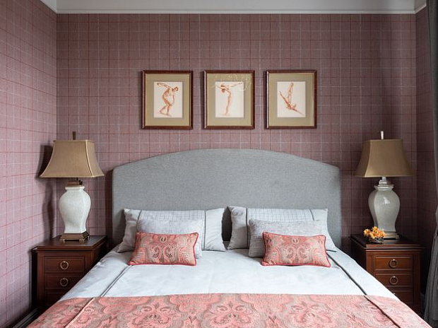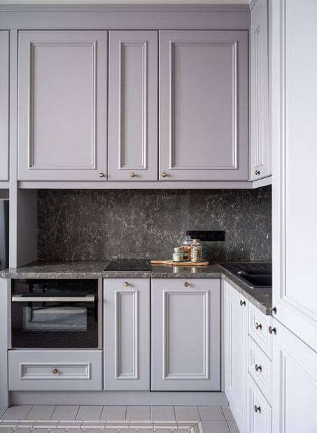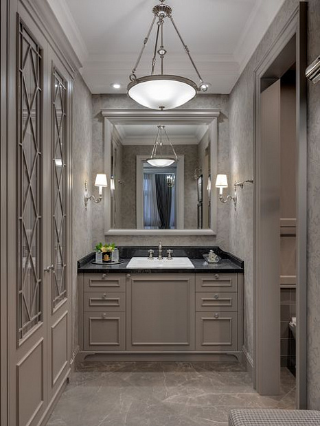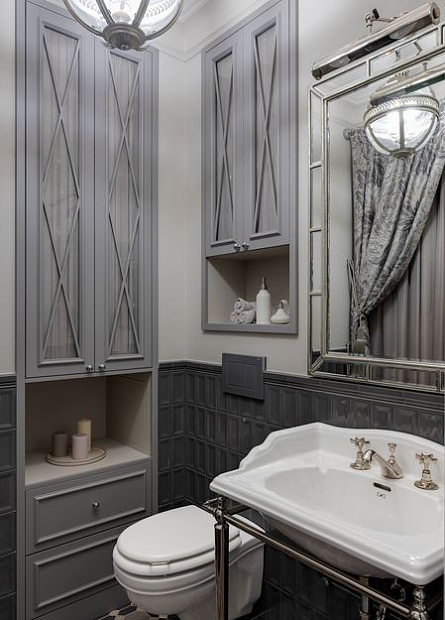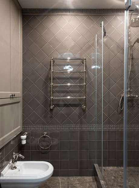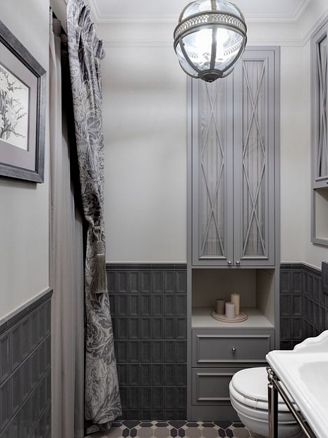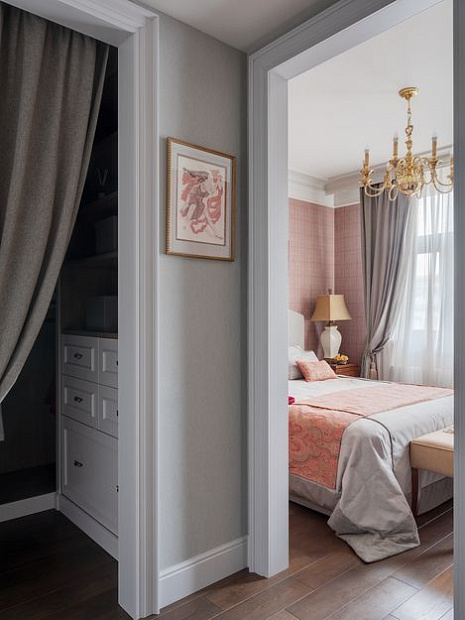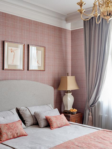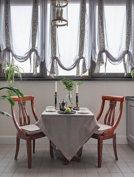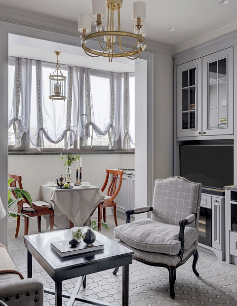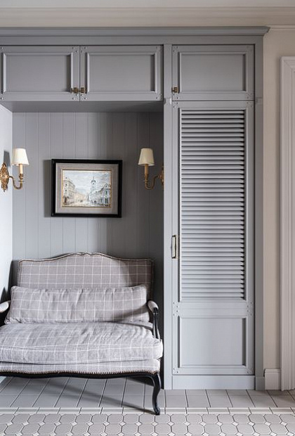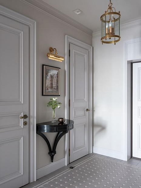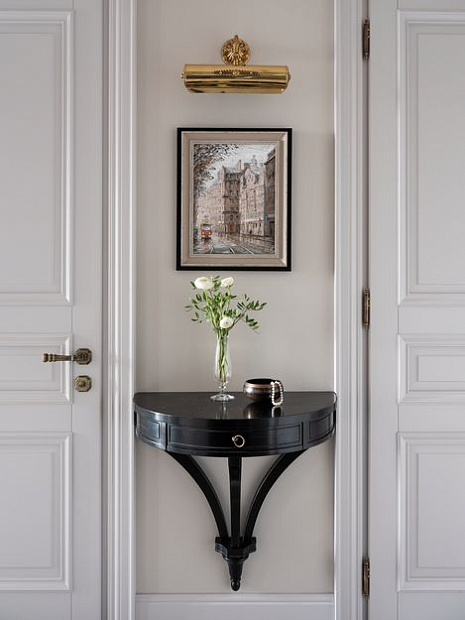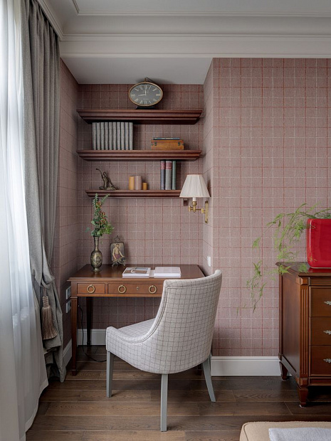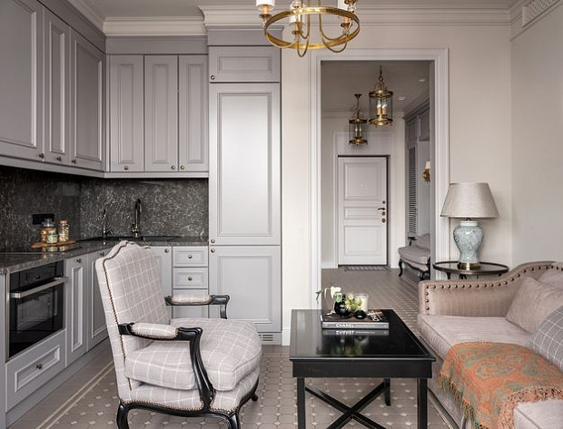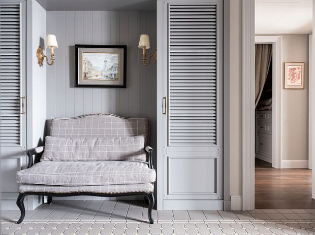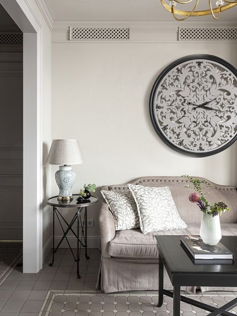 Квартира для семейной пары в классическом стиле спокойной цветовой гаммы. Владельцы живут загородом, поэтому квартира стала местом, чтобы переночевать, оставаясь допоздна по делам в городе. На небольшой площади по просьбе заказчиков сделана перепланировка: расширена зона прихожей, выделены два санузла, вместительная гардеробная. Кухня-гостиная разделена порталом и мебелирована кухонным гарнитуром, винным шкафом и диваном. Примечательные элементы дизайна - антикварные стол и стулья в столовой и часы в виде барельефа растительного мотива. Вдоль стены прихожей ниша с диваном и встроенными по периметру шкафами для хранения вещей. В спальне нейтральные теплые оттенки и узор клеткой создают уютную атмосферу. Углубление стены рядом с окном обыграно созданием рабочей зоны. По просьбе заказчиков в приватной части квартиры выделены гардеробная и большой санузел из 2 зон, напоминающий жилое пространство. В одной его части обклеенное водоотталкивающими обоями место для умывания с большим зеркалом и шкафами. Просторная зона душевой обложена плиткой, на одной из стен за панелями скрыта система хранения.