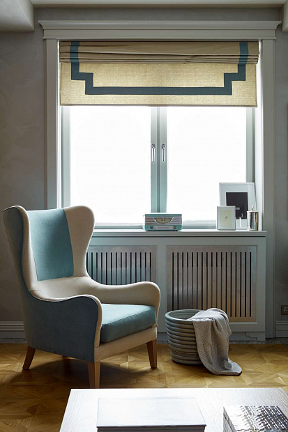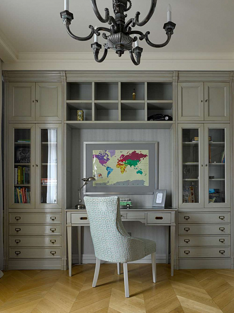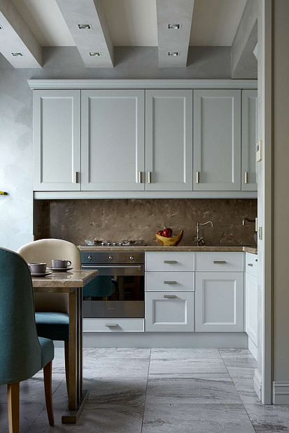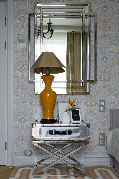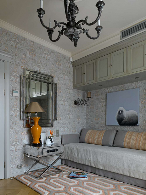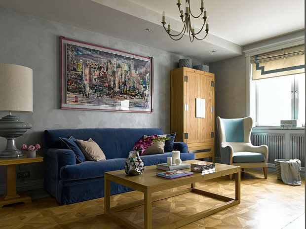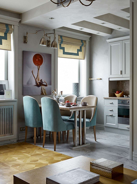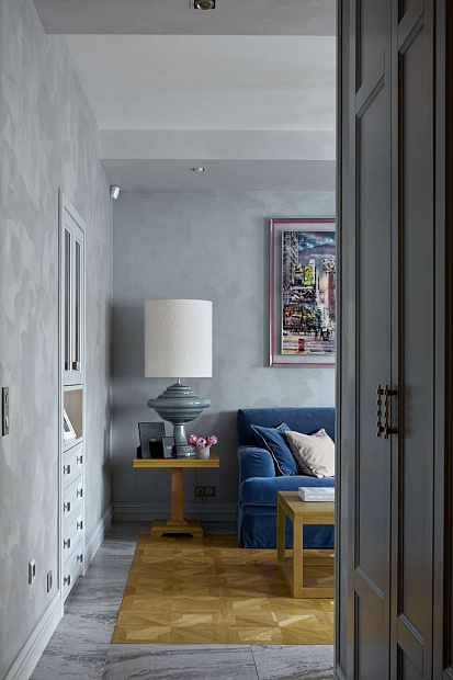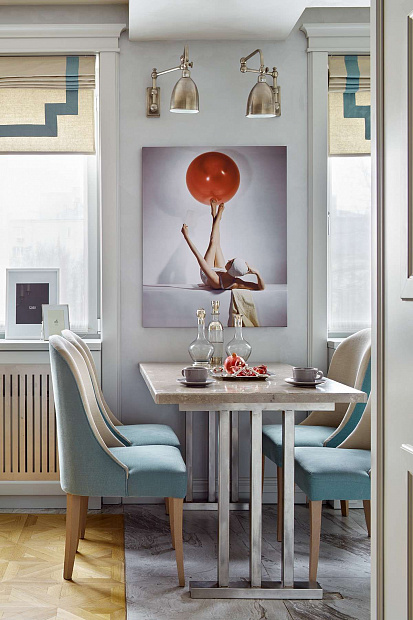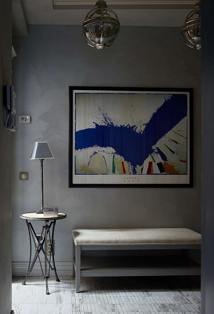 Отправной точкой в выборе стиля квартиры стала картина в гостиной, которую заказчица купила во Франции и непременно хотела вписать в интерьер. В результате пространство получилось эклектичным в холодных спокойных тонах с яркими цветовыми акцентами.