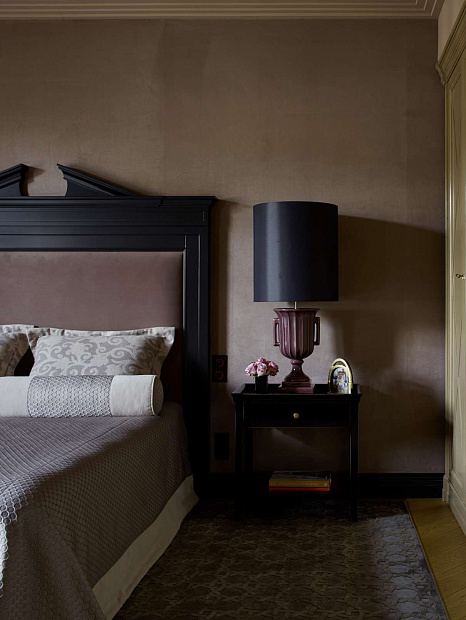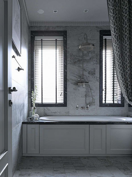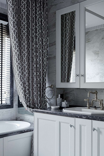 2 окна добавляют света камерной монохромно серой ванной комнате. В одну из стен по просьбе хозяйки встроен скрытый телевизор. В спальне имитирующие замшу обои и фактурный текстиль создают дополнительный уют и тактильно приятный эффект.